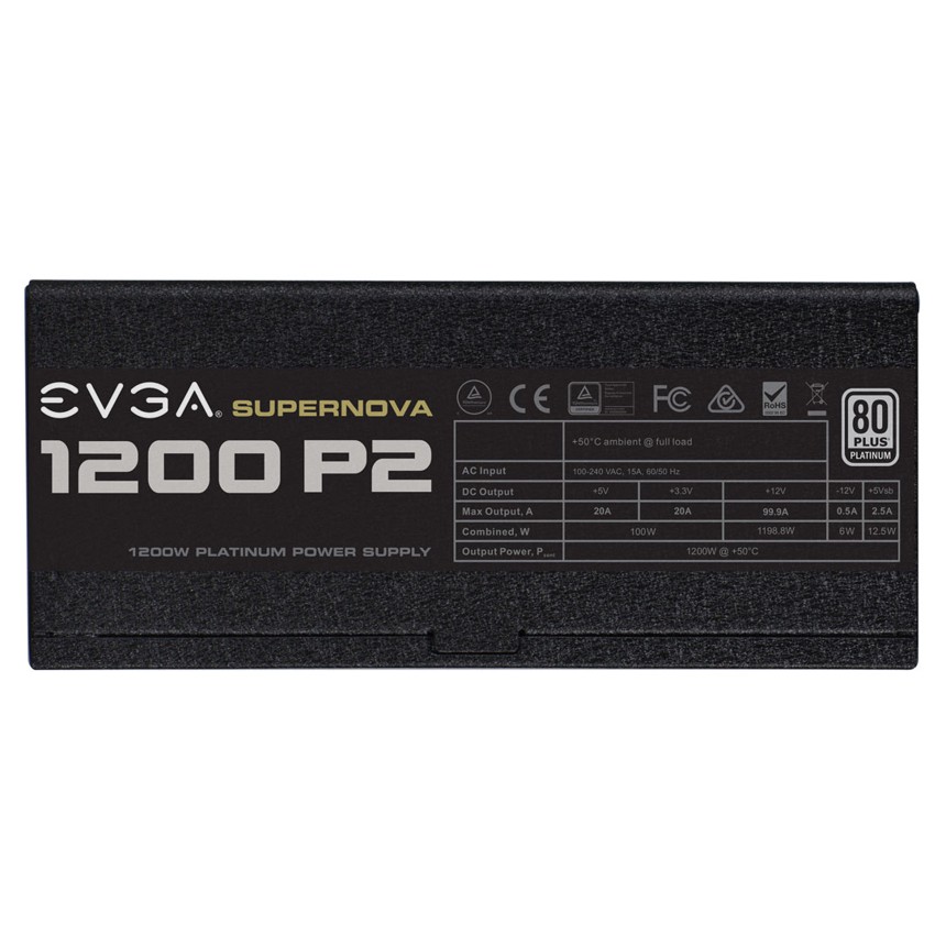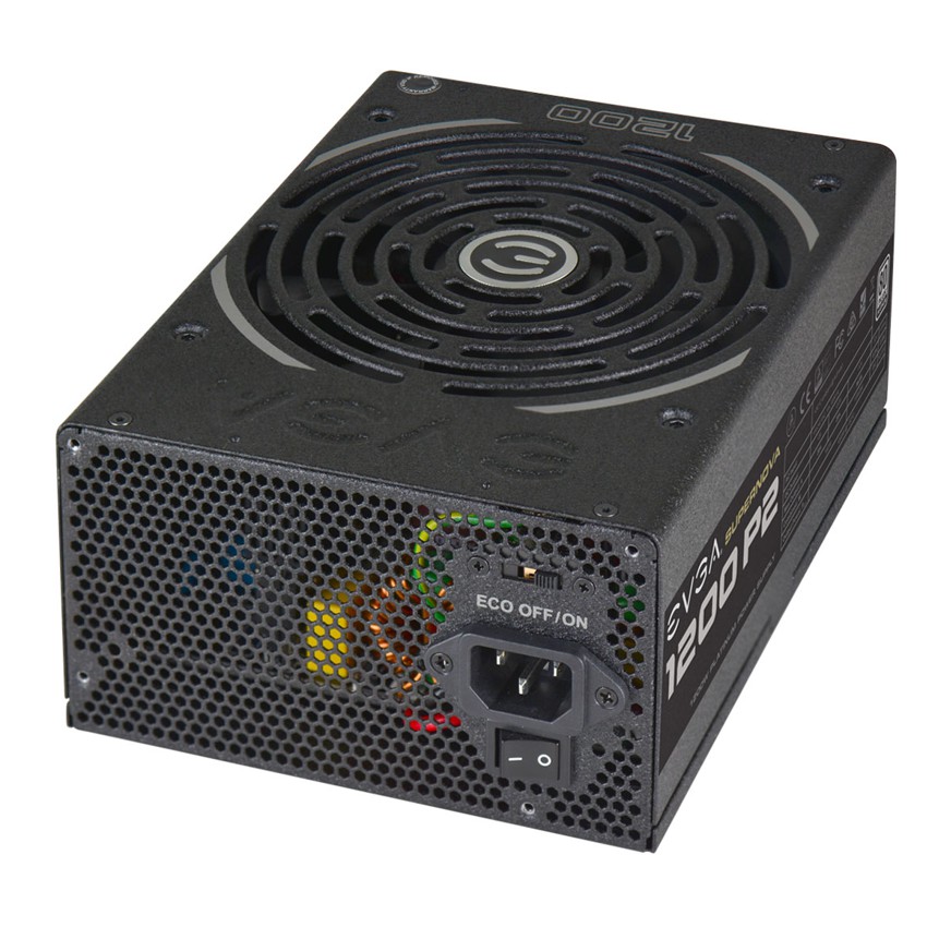 Descripción EVGA SuperNOVA 1200 P2. Potencia total: 1200 W, Voltaje de entrada AC: 100 - 240, Frecuencia de entrada AC: 50 - 60. Diámetro de ventilador: 14 cm. Alimentador de energía para tarjeta madre: 24-pin ATX. Tiempo medio entre fallos: 100000 h. Color del producto: Negro