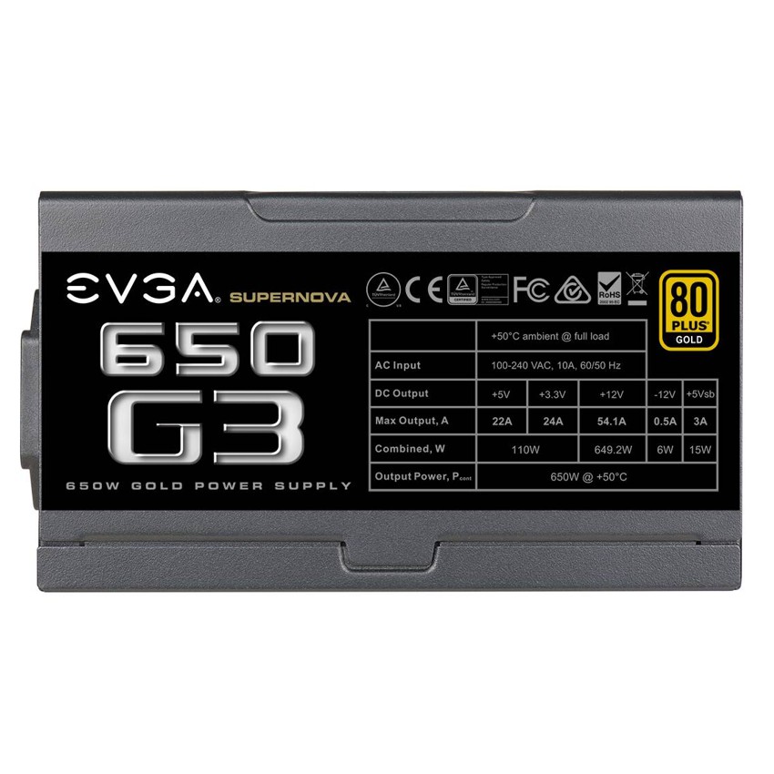 Descripción EVGA 220-G3-0650-Y2. Potencia total: 650 W, Voltaje de entrada AC: 100 - 240, Frecuencia de entrada AC: 50 - 60. Diámetro de ventilador: 13 cm, Número de ventiladores: 1 Ventilador(es), Ubicación de ventilador: Superior. Alimentador de energía para tarjeta madre: 24-pin ATX. Utilizar con: PC, Power supply unit (PSU) form factor: ATX, Tiempo medio entre fallos: 100000 h. Color del producto: Negro