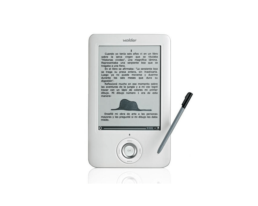 Wolder Ebook Just Boox 6" Wifi + Tactil (D01eb0027)Todo a mano Con este equipo podrás llevar miles de libros con la mayor comodidad y en tus viajes, podrás optar por leer un libro, ver fotografías o escuchar música.Fácil de usar El menú resulta muy intuitivo y además, gracias a su pantalla táctil podrás moverte con comodidad y rapidez. Apunta notas y realiza dibujos para guardarlos como imagen, con el lápiz stylus.Comodidad máxima Gracias a su pantalla e-ink, e-paper antirreflejos de 16 niveles de grises, podrás leer revistas, periódicos y libros evitando la fatiga visual.Múltiples funcionalidades Capacidad de anotación, búsqueda de textos, cambio de tamaño y tipo de letra, reproductor MP3, conexión inalámbrica WIFI, navegación web, amplitud de formatos.Cuidamos del medio ambiente Uno de cada cinco árboles talados se utiliza exclusivamente para fabricar papel. Con tu lector de e-books contribuyes a evitar la deforestación.