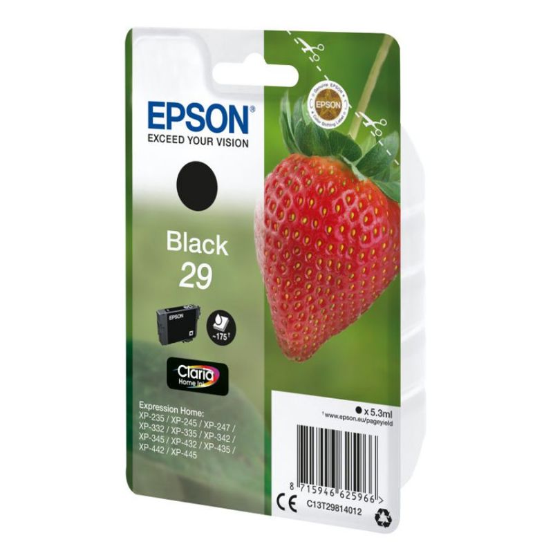 Especificaciones Peso y dimensiones Altura del paquete 102 mm Ancho del paquete 145 mm Profundidad del paquete 26 mm Tipo de embalaje Ampolla Características Cantidad por paquete 1 pieza(s) Cantidad de cartuchos de tinta negra 1 Certificación CE Colores de impresión Negro Código OEM C13T29814012 Marca compatible Epson País de origen China Rendimiento de impresión de página con tinta negra 175 páginas Tecnología de impresión Inyección de tinta Tipo Original Tipo de tinta Tinta a base de pigmentos Volumen de tinta negra 5,3 ml Datos logísticos Alto de la caja principal 14,6 cm Altura del palé 39 cm Ancho de la caja principal 10,2 cm Anchura del palé 80 cm Cantidad por palé 3400 pieza(s) Cantidad por caja 10 pieza(s) Cantidad por palé (Reino Unido) 3400 pieza(s) Cantidad por capa de palet 340 pieza(s) Cantidad por capa de palé (Reino Unido) 340 pieza(s) Cantidad mínima del pedido 10 pieza(s) Longitud del palé 120 cm Longitud de la caja 26 cm