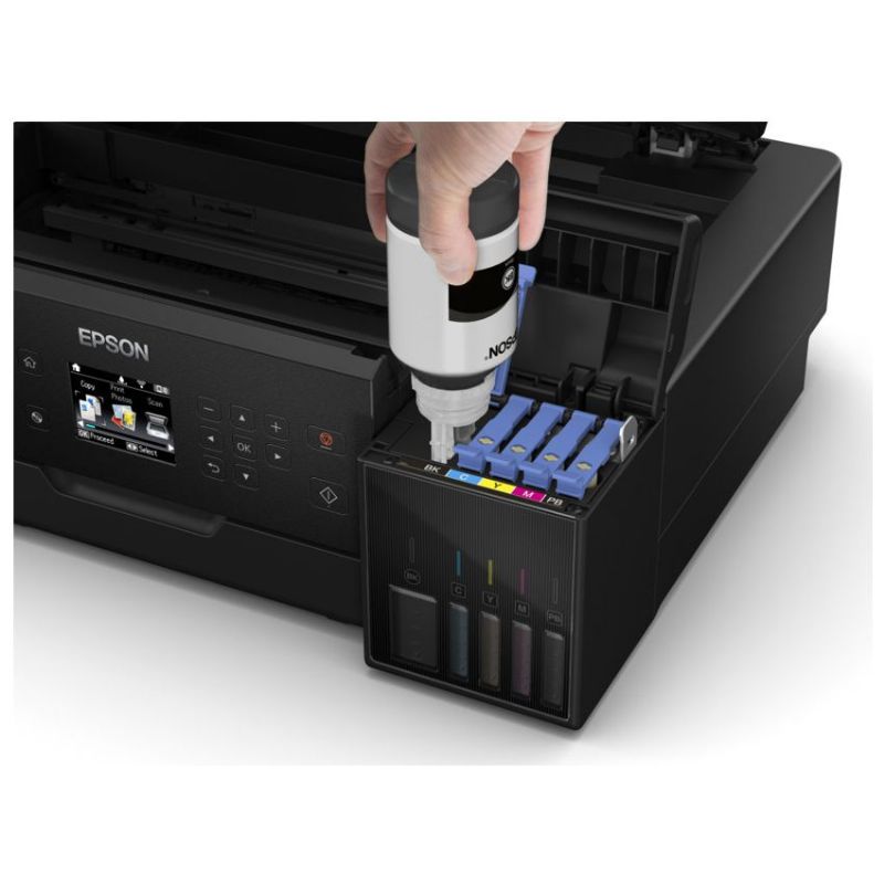 Descripción Potencia tu creatividad Disfruta de la impresión fotográfica sin preocuparte por el coste con esta EcoTank sin cartuchos. Incluye suficiente tinta para imprimir hasta 3.400 fotos1 (10 × 15 cm). Sus depósitos de gran capacidad eliminan la necesidad de cartuchos y posibilitan la impresión de mucho material entre recargas. Impresión fotográfica de calidad Imprime fotos de alta calidad que pueden durar hasta 300 años en un álbum fotográfico2 con este sistema de tinta de cinco colores, que incluye tinta fotográfica negra. Además, cuenta con ranura para tarjeta SD, función de impresión sin márgenes, dos bandejas de papel y una pantalla LCD de 6,8 cm. Descubre la nueva generación de EcoTank Ahora, el depósito se incorpora en la parte frontal, por lo que EcoTank es una impresora más compacta y más fácil de usar que nunca. Evita que te manches e incluye un sistema mejorado para el rellenado de tinta pensado para realizar recargas sin problemas. Las nuevas botellas también incorporan un mecanismo para garantizar que solo se insertan los colores correctos. Impresión móvil sencilla Con Wi-Fi y Wi-Fi Direct, puedes enviar archivos para imprimirlos desde dispositivos inteligentes mediante la aplicación Epson iPrint3. Gracias a la aplicación Creative Print3, que te permite imprimir fotos, crear tarjetas de felicitación, libros para colorear y mucho más, podrás sacar el máximo partido a tus fotos de Facebook con facilidad. Tranquilidad EcoTank ofrece una solución de impresión fiable con garantía de tres años (a partir del registro).