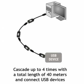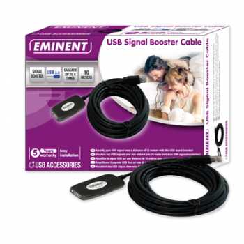 Descripción Desea conectar su dispositivo USB pero el cable es demasiado corto, el amplificador de señal USB EM1020 de Eminent le permitirá amplificar la señal USB hasta una distancia de 10 metros. También le permite enlazar hasta un máximo de 4 unidades del amplificador USB para aumentar la distancia.