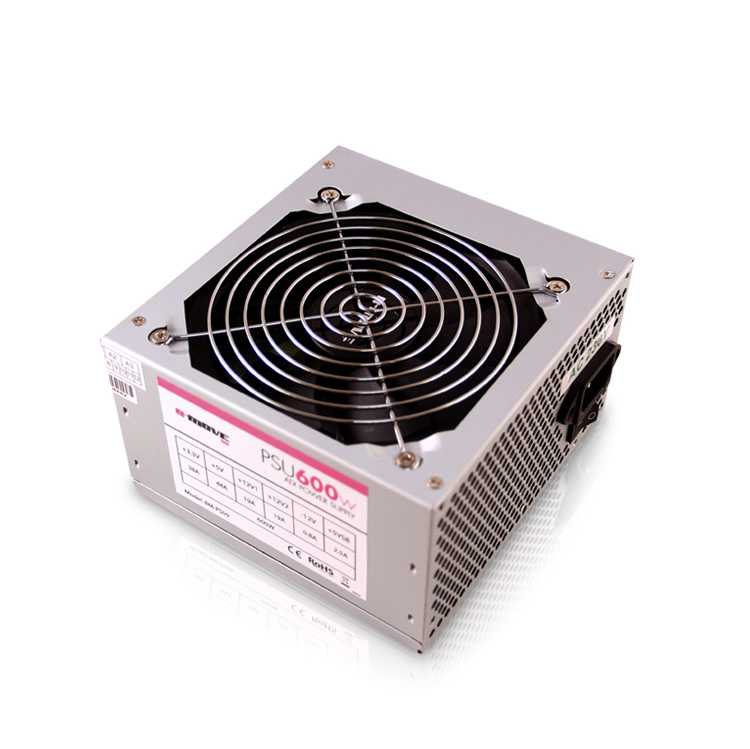 Fuente de alimentación de 600W con dos conectores SATA y un ventilador de 120 mm con aspas en color negro.