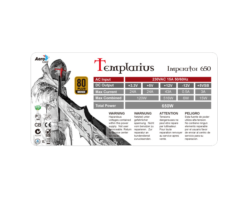 FUENTE DE ALIMENTACIÓN - Estilo “Caballero Blanco” Templarius con iluminación blanca para una estética impresionante - Certificado 80 + BRONZE para una alta eficiencia energética de hasta 85%. - Corrector de potencia Activo (APFC) con un 99% de eficiencia para una conversión de energía estable y una fiabilidad general. - Ventilador ultra silencioso de 139mm con control inteligente de velocidad y tecnología patentada G-Flow con un guiado preciso del flujo del aire. - Rail único de +12v robusto para necesidades de potencia extrema. - Compatible con CPU Dual Core, ATI CrossFire, NVIDIA SLI y todas las tecnologías multi-core de GPU. - Construido con soporte para la nueva generación de tarjetas graficas con conector 6 +2 pines PCI-Express. - Ingeniería europea y seguridad certificada internacionalmente por reconocidos laboratorios de pruebas internacionales. - Rendimiento total 24/7. - Vida ultra larga de hasta 120.000 horas. - Cumplimiento de las normas Intel ATX 12V 2.3 & SSI EPS 12V 2.92. - Regulación del voltaje excelente (± 5%): proporciona una entrada de alimentación constante y estable. - Incluye Protecciones de grado Industrial: Sobre Corriente, Sobre Voltaje, Sobre Potencia, Sobre temperatura y Protección anti corto-circuito. - Seguridad / EMI Aprobaciones: CE, CB, TUV, FCC, UL.