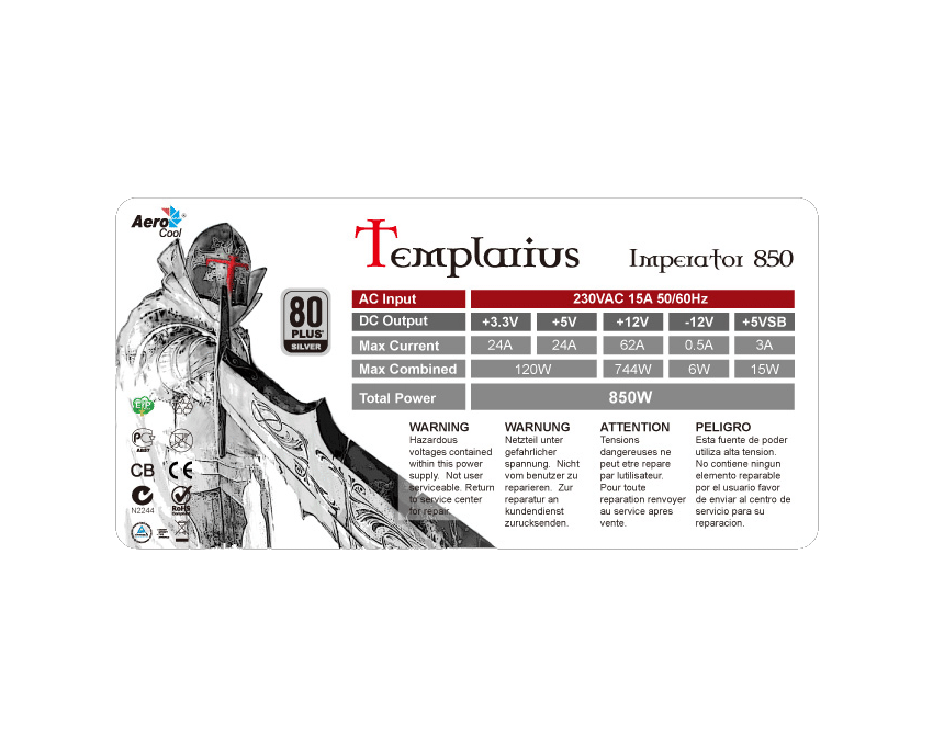 Fuente de Alimentacion AEROCOOL Templarius Imperator 850W 80Plus Silver Cod. Producto: Q-7221   ||  Fabricante: AEROCOOL Part Number: IMP850    Stock: 0 Unidades 108,00 €