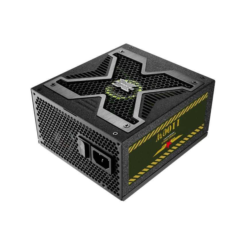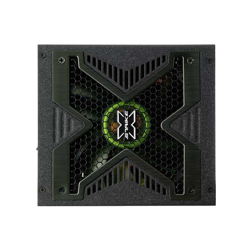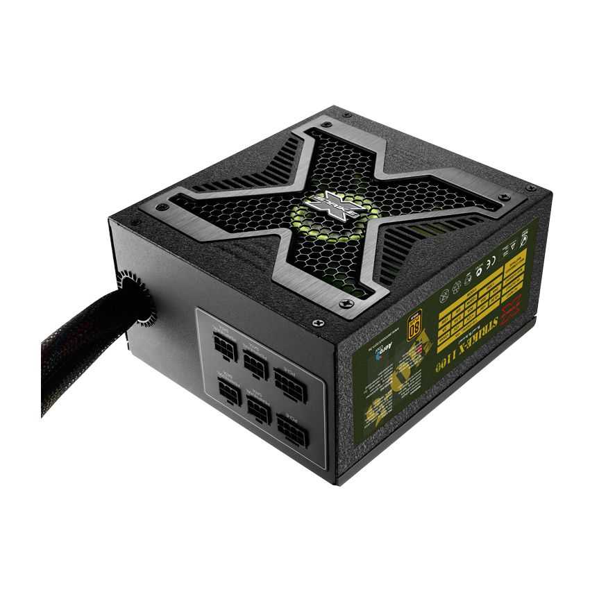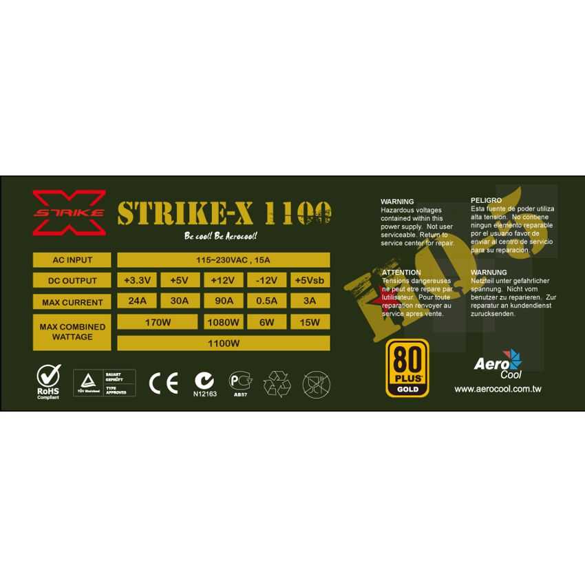 Aerocool Strike-X Army 1100W. Potencia nominal: 1100 W, Voltaje de entrada AC: 115 - 230 V, Corriente de entrada: 15 A. Diámetro de ventilador: 139 mm, Tipo de enfriamiento: Activo. Alimentador de energía para tarjeta madre: 20+4 pin ATX. Ancho: 150 mm, Profundidad: 165 mm, Altura: 86 mm. Tiempo medio entre fallos: 120000 h - Fuente de Alimentación Gaming. - Nueva Edición "Ejército" en colores negro y verde. - Ventilador de 13,9 mm ultra silencioso con control de velocidad inteligente. - Alta eficiencia 80 Plus Gold. - Fundas negras para organizar el cableado interior y mejorar el flujo de aire del sistema. - Capacidad para Dual Core CPU, ATI CrossFire, NVIDIA SLi y todas las tecnologías Multi-Cor. - Construido con la última generación 6 + 2 pin, conector de tarjeta gráfica PCI-Express. - Corrección del factor de potencia (PF>0.99) PFC ACTIVO. - Regulación de voltaje extremadamente buena (+/-5%): proporciona potencia de entrada constante. - Alta fiabilidad: MTBF> 120.000 hours. - Diseño de energía ecológico que cumple con los requisitos de ERP. - Pegatinas de impacto de bala para un modding personalizable. - Protecciones: sobre corriente, sobre voltaje, sobre temperatura, protección de bajo voltaje y cortocircuitos. - Seguridad / Aprobaciones EMI: CE, FCC, TUV, Gost, CB