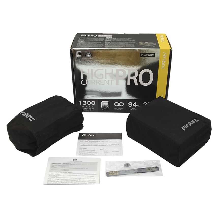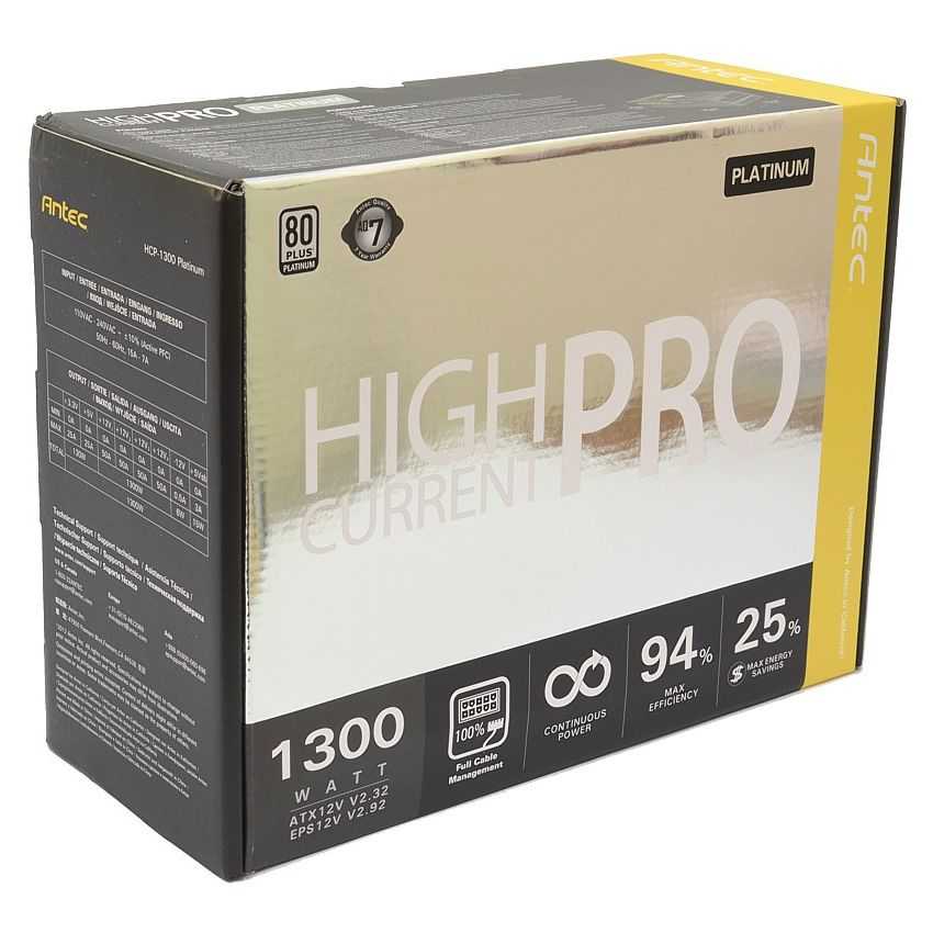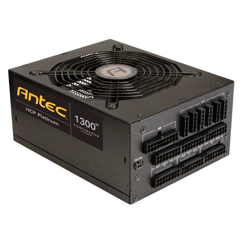 Descripción Antec HCP-1300 Platinum. Potencia nominal: 1300W, Voltaje de entrada AC: 110 - 240V, Tolerancia de voltaje: 10%. Diámetro de ventilador: 13.5 cm, Ubicación de ventilador: Superior, Tipo de enfriamiento: Activo. Alimentador de energía para tarjeta madre: 24-pin ATX, Tipo de cableado: Modular. Utilizar con: PC, Versión ATX: 2.32, Versión EPS: 2.92. Color del producto: Negro