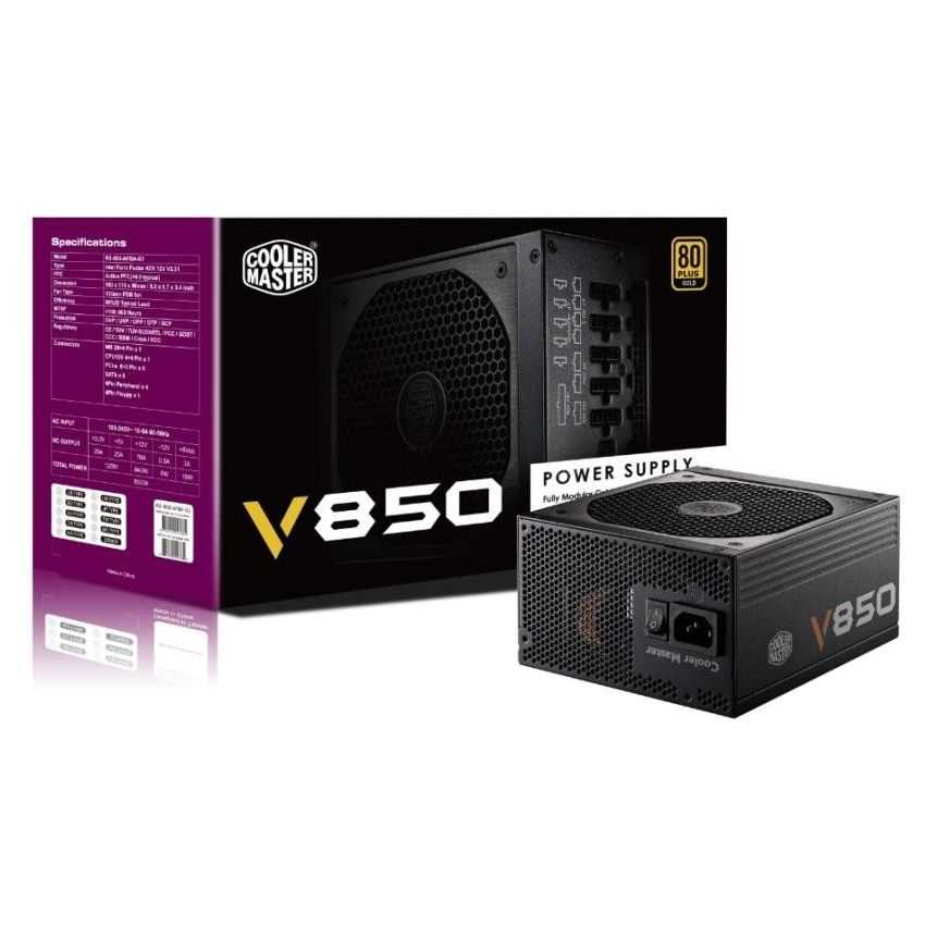 Descripción Cooler Master V850. Potencia nominal: 850 W, Voltaje de entrada AC: 90 - 264 V, Frecuencia de entrada AC: 50 - 60 Hz. Diámetro de ventilador: 13,5 cm, Ubicación de ventilador: Superior, Tipo de enfriamiento: Activo. Alimentador de energía para tarjeta madre: 20+4 pin ATX, Tipo de cableado: Modular. Factor de forma: ATX, Utilizar con: PC, Versión ATX: 2.31. Color del producto: Negro