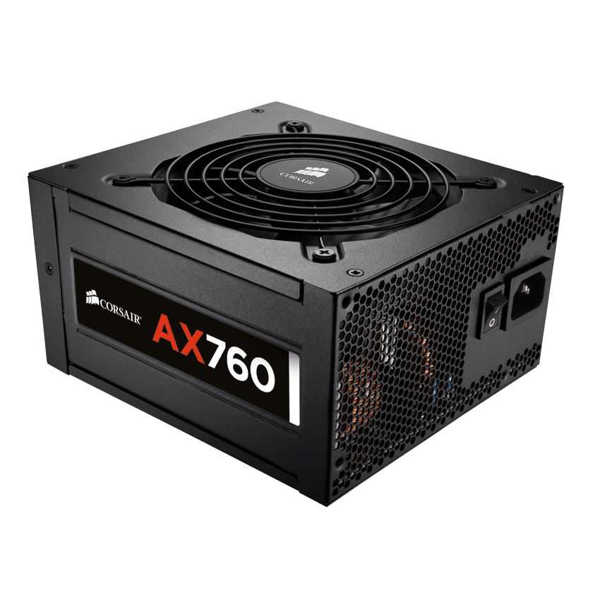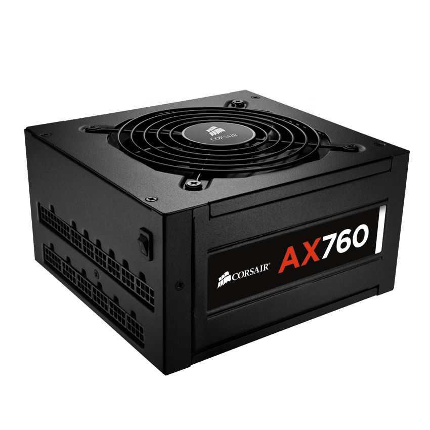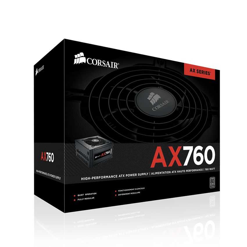 Descripción Corsair AX760 80Plus Platinum. Potencia nominal: 760 W, Voltaje de entrada AC: 100 - 240 V, Frecuencia de entrada AC: 50 - 60 Hz. Diámetro de ventilador: 12 cm, Tipo de enfriamiento: Activo. Alimentador de energía para tarjeta madre: 24-pin ATX. Factor de forma: ATX, Utilizar con: PC, Versión ATX: 2.31. Color del producto: Negro