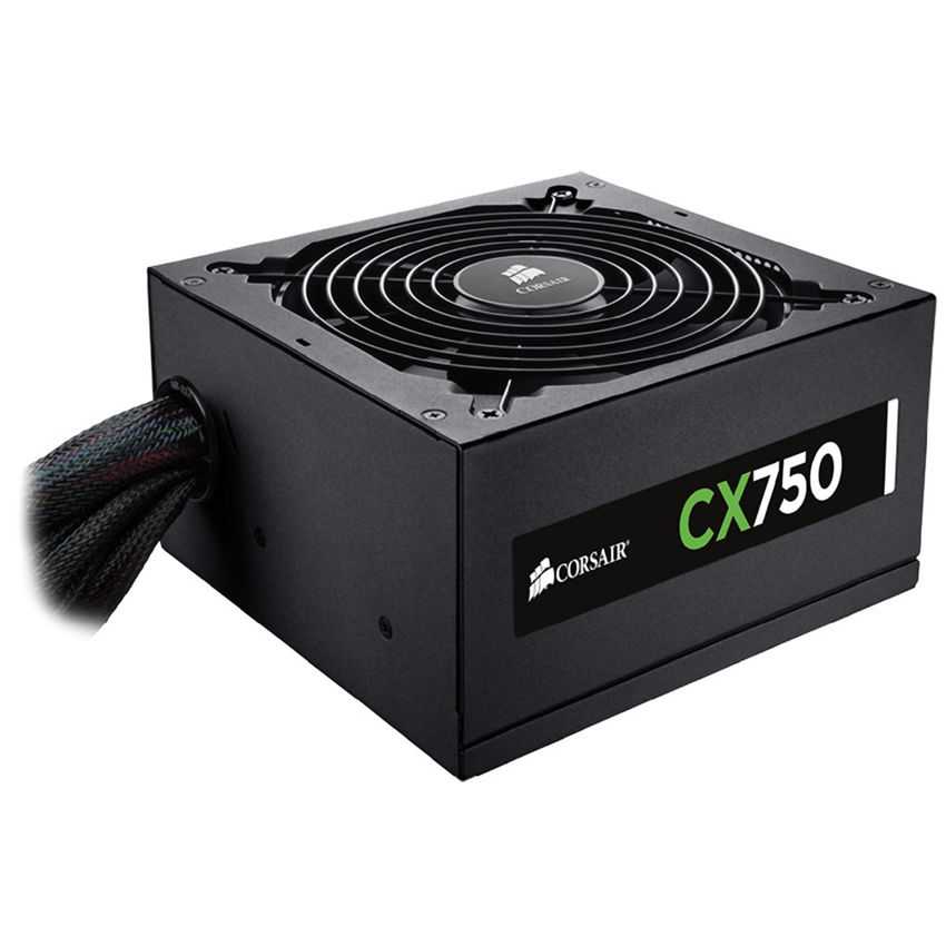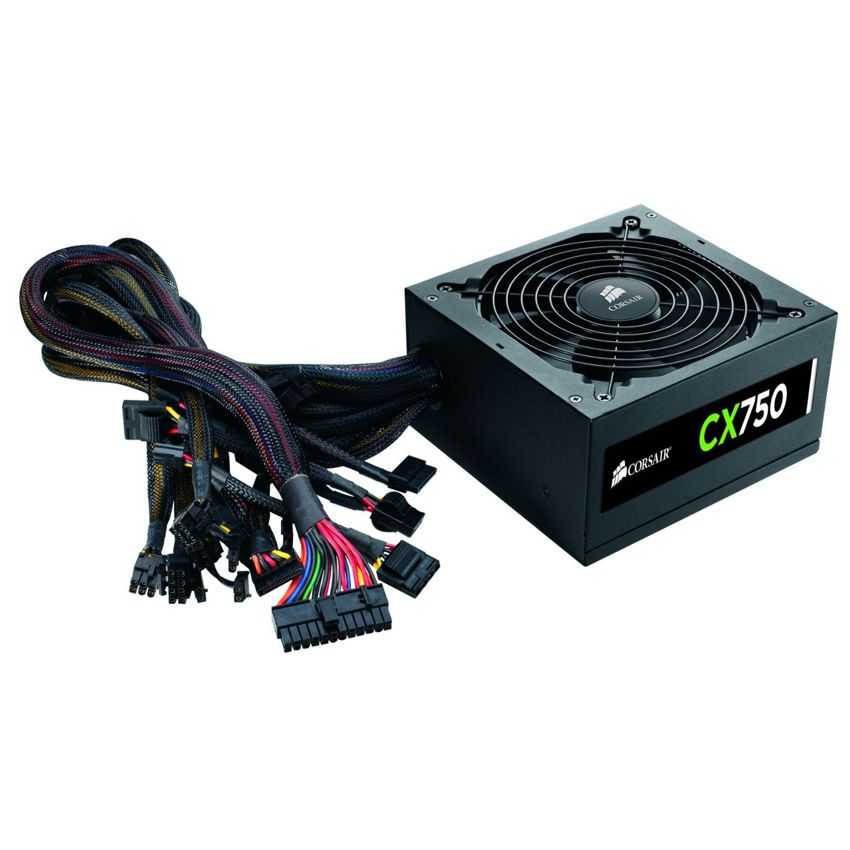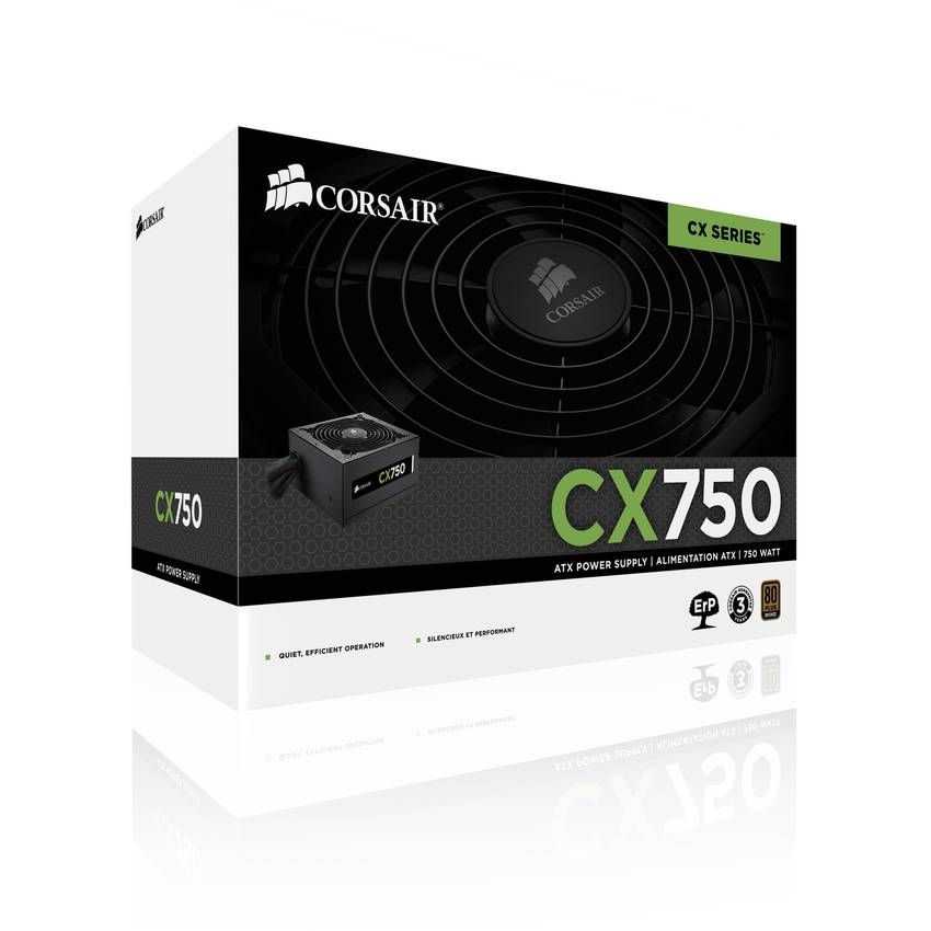 Descripción Corsair CX750. Potencia nominal: 750 W, Voltaje de entrada AC: 90 - 264 V, Frecuencia de entrada AC: 47 - 63 Hz. Ubicación de ventilador: Superior, Tipo de enfriamiento: Activo. Conector de poder para tarjeta madre: 24-pin ATX. Ancho: 150 mm, Profundidad: 160 mm, Altura: 86 mm. Tiempo medio entre fallos: 100000 h