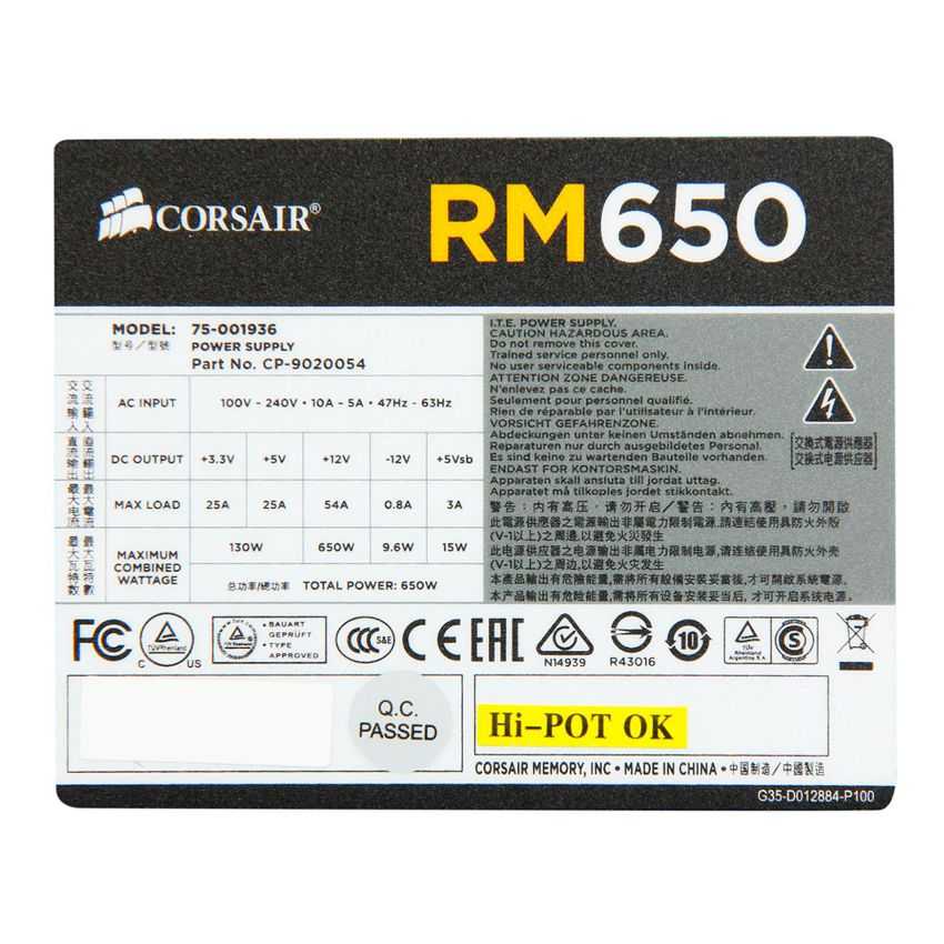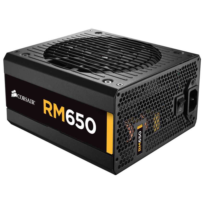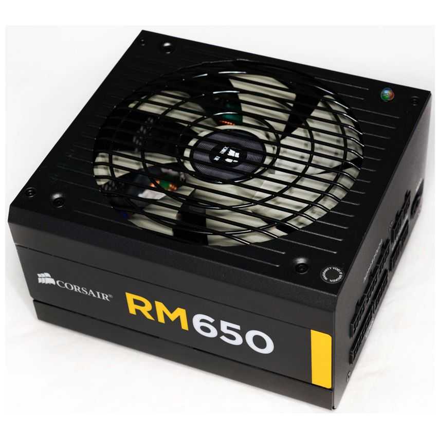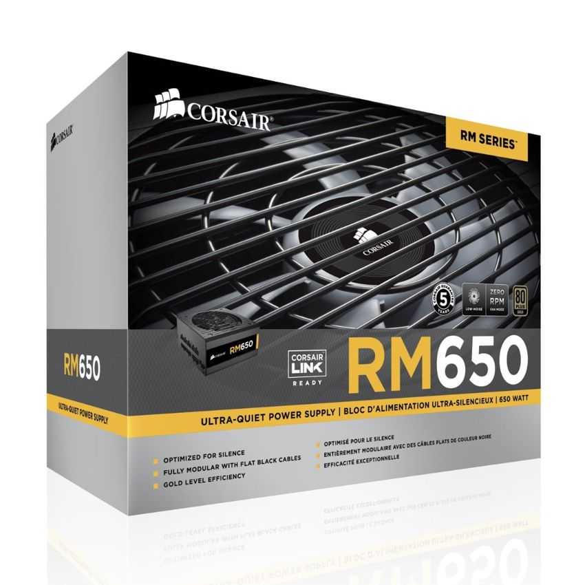 Descripción Corsair RM650. Potencia nominal: 650W, Máxima energía: 715W, Voltaje de entrada AC: 100 - 240V. Diámetro de ventilador: 14 cm, Ubicación de ventilador: Superior, Velocidad de ventilador: 1050 RPM. Alimentador de energía para tarjeta madre: 20+4 pin ATX, Tipo de cableado: Modular. Factor de forma: ATX, Utilizar con: PC, Versión ATX: 2.4. Color del producto: Negro