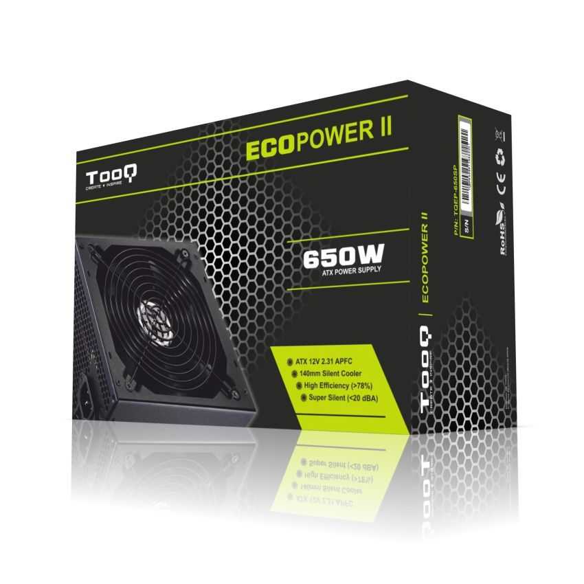 Especificaciones Potencia nominal: 650 W Corrección del factor de potencia tipo (PFC): Pasivo Funciones de protección de poder: Over voltage, Overload, Short circuit, Under voltage Diámetro de ventilador: 140 mm Número de ventiladores: 1 Velocidad de ventilador: 1200 RPM Alimentador de energía para tarjeta madre: 24-pin ATX Número de conectores de energía SATA: 4 Conectores de poder PCI Express (6 pin): 1 Conectores de poder PCI Express (6 + 2 pin): 1 CPU conector de alimentación (4 +4 pines): Y Conector de poder a CPU (8-pin): 1 Nivel de ruido: 20 Db Ancho: 150 mm Profundidad: 161 mm Altura: 85 mm Factor de forma: ATX Versión ATX: 1.3 Color del producto: Negro Protección de sobrecarga: Y