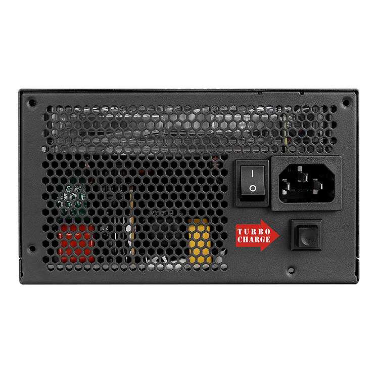 El ventilador de 14 cm proporciona una ventilación optimizada a los componentes internos de la fuente y el botón 'turbo' nos porporciona 100W extra de potencia haciendo funcionar el ventilador a máxima velocidad y cambiando el color del LED de azul a rojo.
