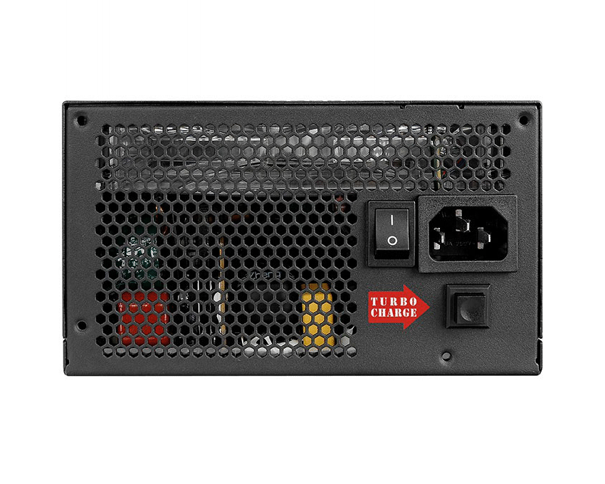 El ventilador de 14 cm proporciona una ventilación optimizada a los componentes internos de la fuente y el botón 'turbo' nos porporciona 100W extra de potencia haciendo funcionar el ventilador a máxima velocidad y cambiando el color del LED de azul a rojo.