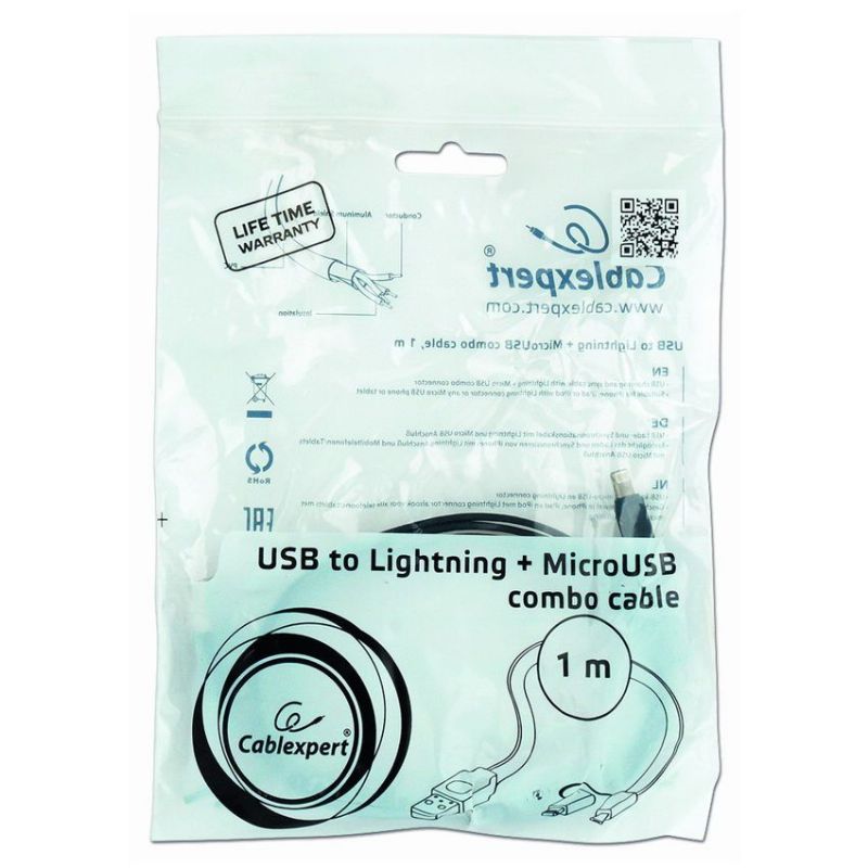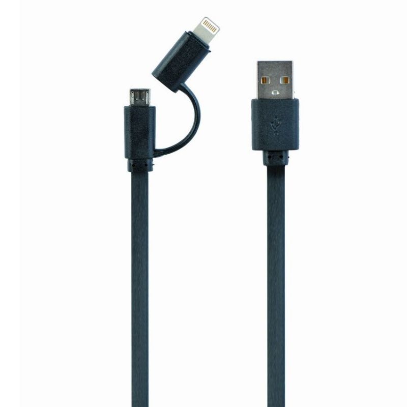 Descripción Gembird CC-USB2-AMLM2-1M. Longitud de cable: 1 m, Conector 1: USB A, Conector 2: Micro-USB B/Lightning, Género del conector: Macho/Macho, Color del producto: Negro