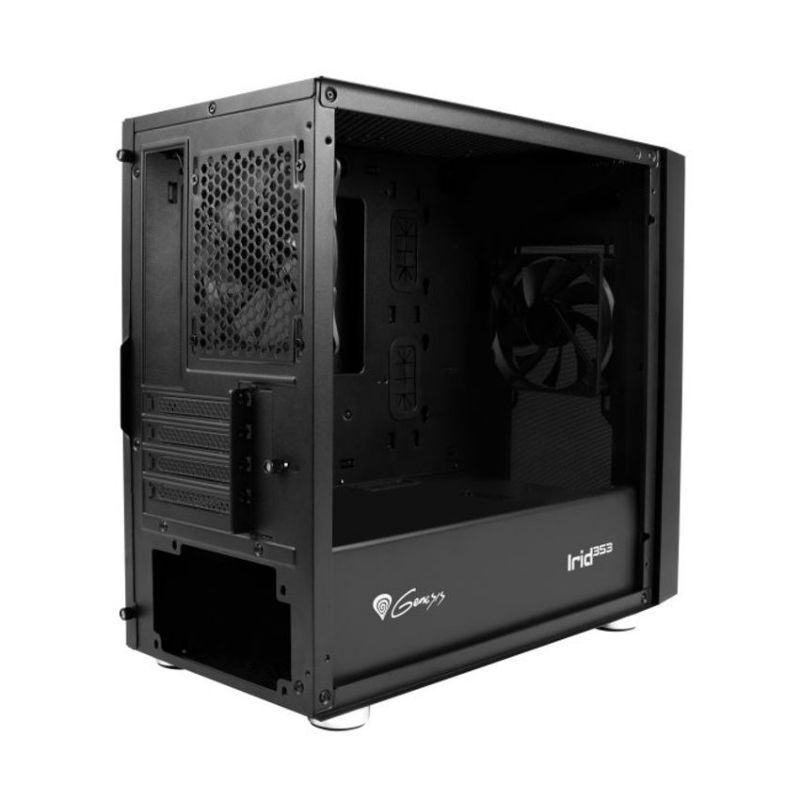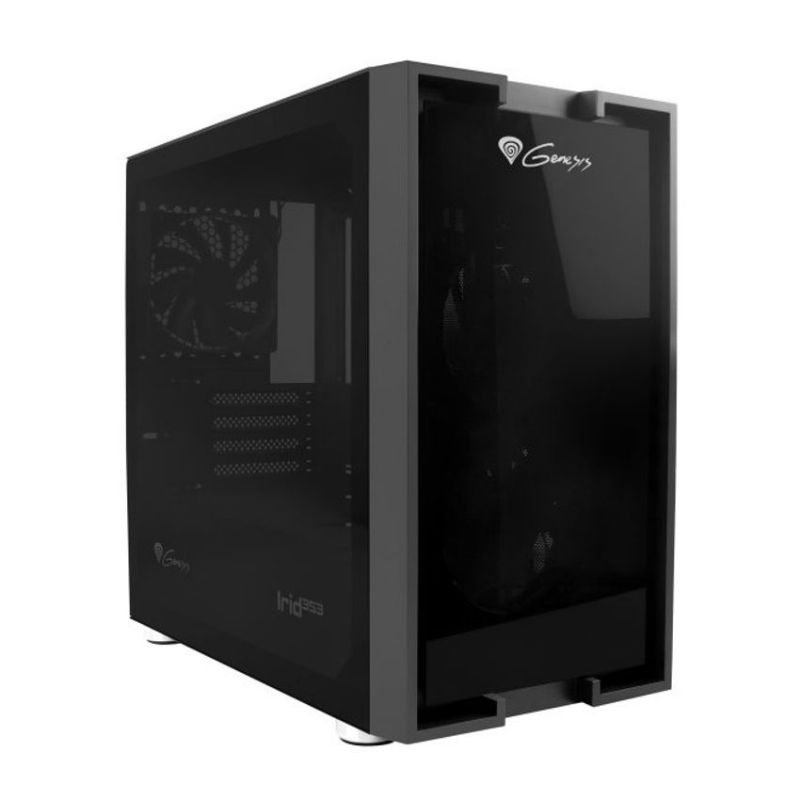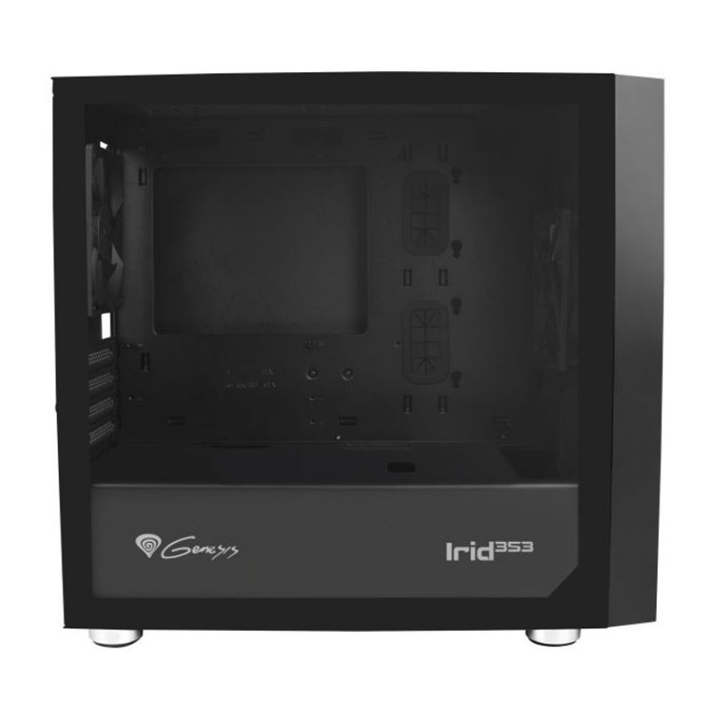 Descripción GENESIS Irid 353. Factor de forma: Micro Tower, Tipo: PC, Material: Acrilonitrilo butadieno estireno (ABS), Acero, Vidrio templado. Ubicación de fuente de alimentación: Fondo. Ventiladores frontales instalados: 1x 120 mm, Diámetro de ventiladores frontales soportados: 120,140 mm, Ventiladores traseros instalados: 1x 120 mm. Tamaños de disco duro soportados: 2.5,3.5". Ancho: 210 mm, Profundidad: 429 mm, Altura: 393 mm