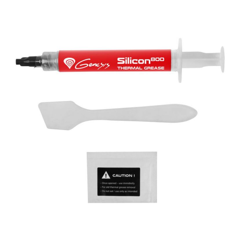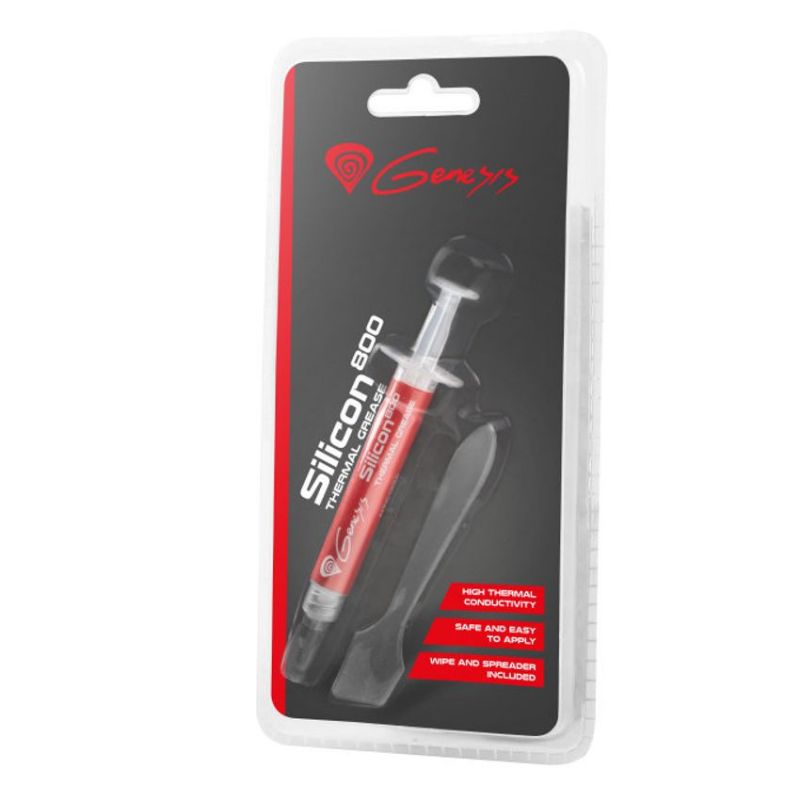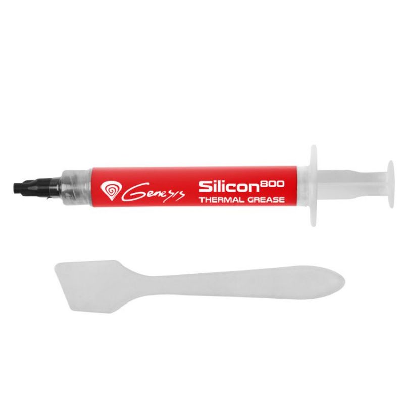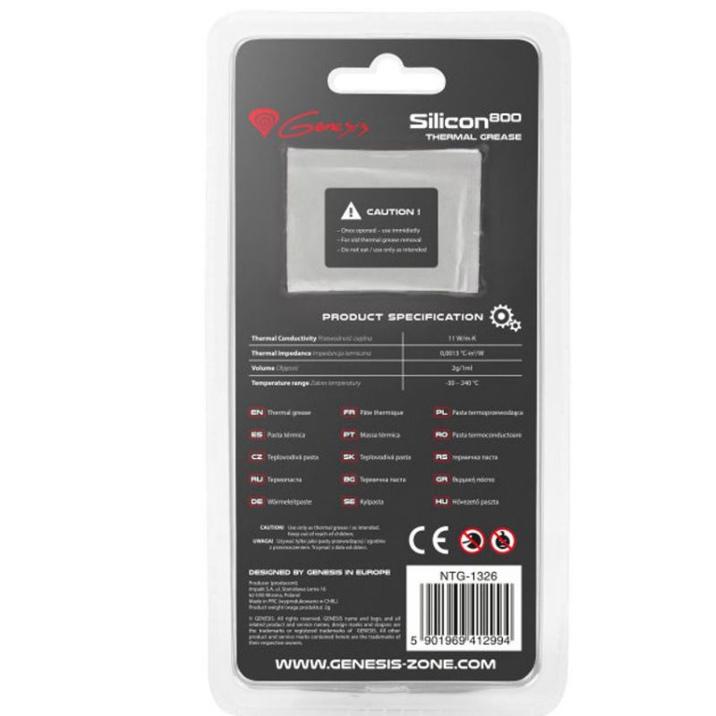 Descripción GENESIS Silicon 800. Tipo: Pasta térmica, Conductividad térmica: 11 W/m·K, Densidad: 1,6 g/cm³. Volumen: 1,25 ml, Peso: 2 g. Tipo de embalaje: Ampolla