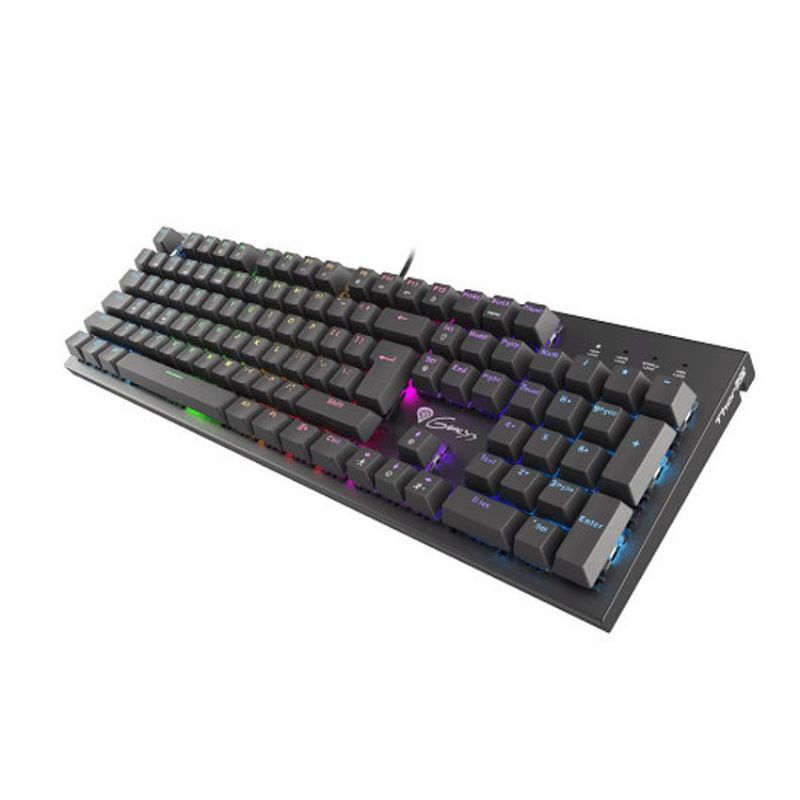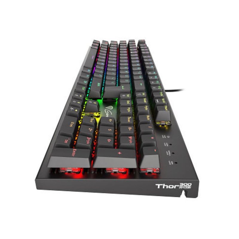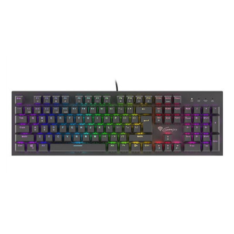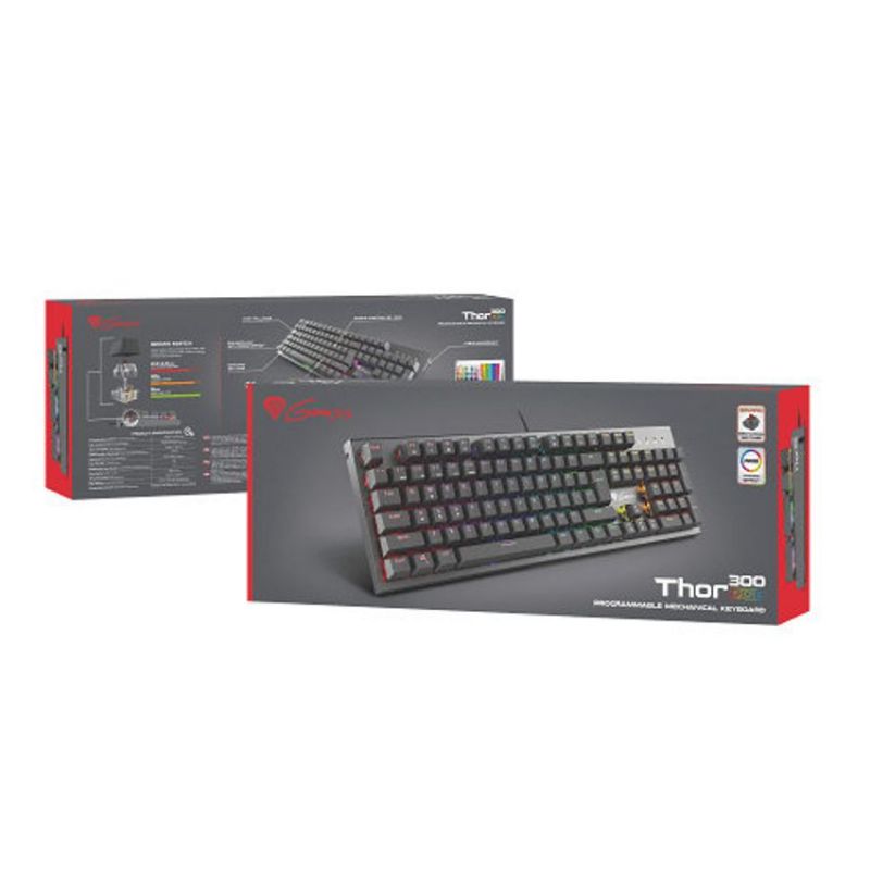 Descripción GENESIS THOR 300 RGB. Formato del teclado: Estándar. Estilo de teclado: Derecho. Interfaz del dispositivo: USB, Interruptor del teclado: Interruptor mecánico, Diseño de teclado: QWERTY, Teclado, cantidad de teclas: 104. Tipo de retroiluminación: LED RGB. Longitud de cable: 1,75 m. Uso recomendado: Juego. Color del producto: Negro