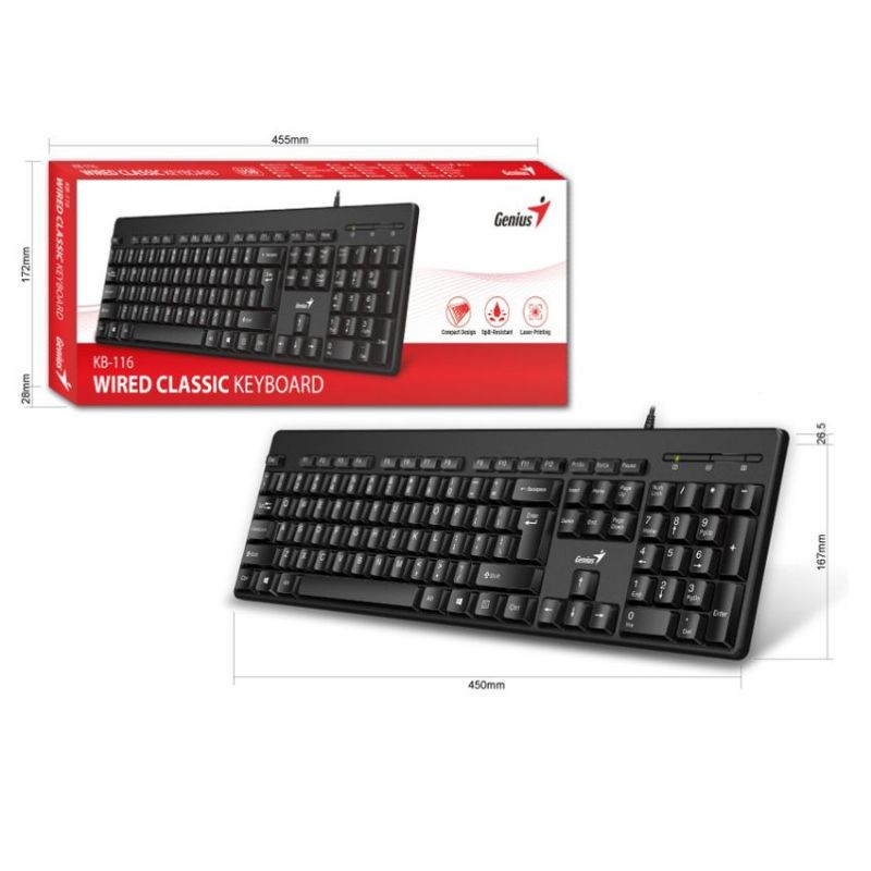 Descripción Genius KB-116. Formato del teclado: Estándar. Estilo de teclado: Derecho. Interfaz del dispositivo: USB, Diseño de teclado: QWERTY. Longitud de cable: 1,4 m. Uso recomendado: Universal. Color del producto: Negro