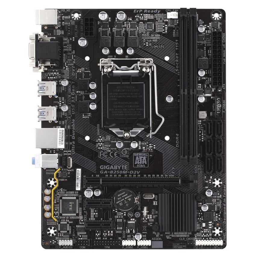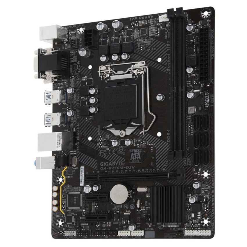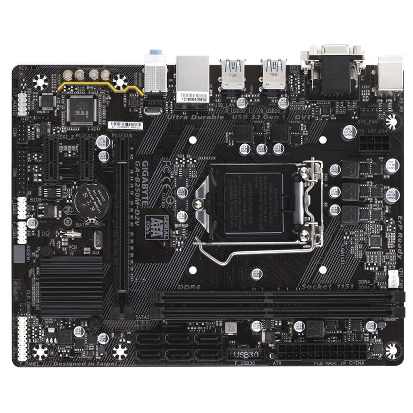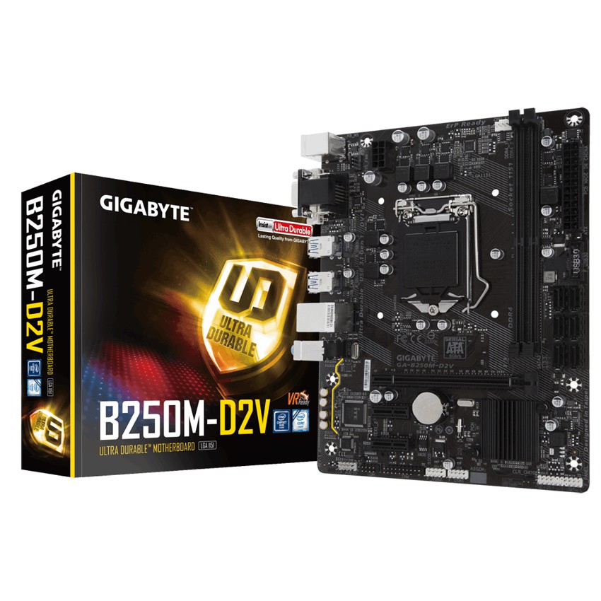 Descripción Gigabyte GA-B250M-D2V. tipos de memoria compatibles: DDR4-SDRAM, Tipo de ranuras de memoria: DIMM, Velocidades de reloj de memoria soportadas: 2133,2400 MHz. Familia de procesador: Intel, Procesador compatible: Celeron,Core i3,Core i5,Core i7,Pentium, Socket de procesador: LGA 1151 (Socket H4). Tipo de interfaz ethernet: Fast Ethernet. Componente para: PC, Familia de componentes de tarjeta madre: Intel, Circuito integrado de tarjeta madre: Intel B250. Tipos de BIOS: EFI AMI, BIOS, tamaño de memoria: 64 MB