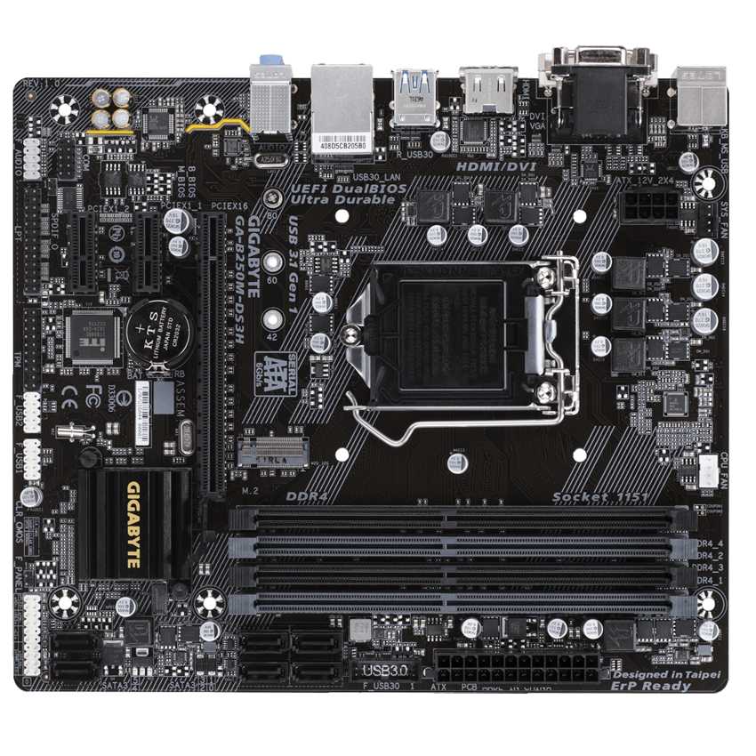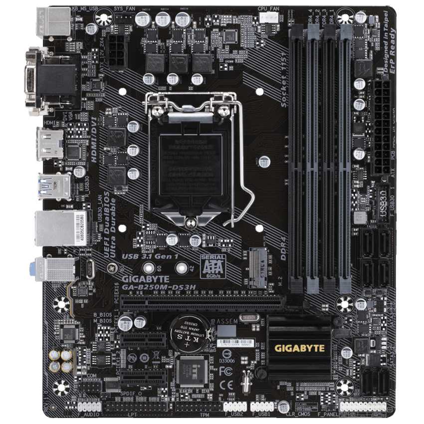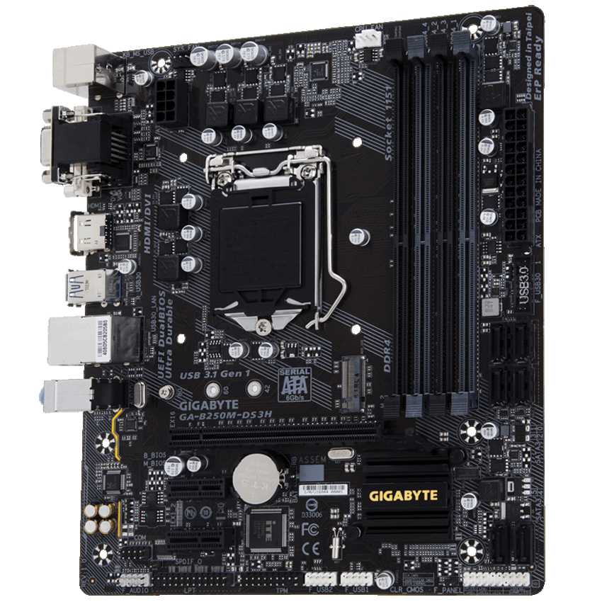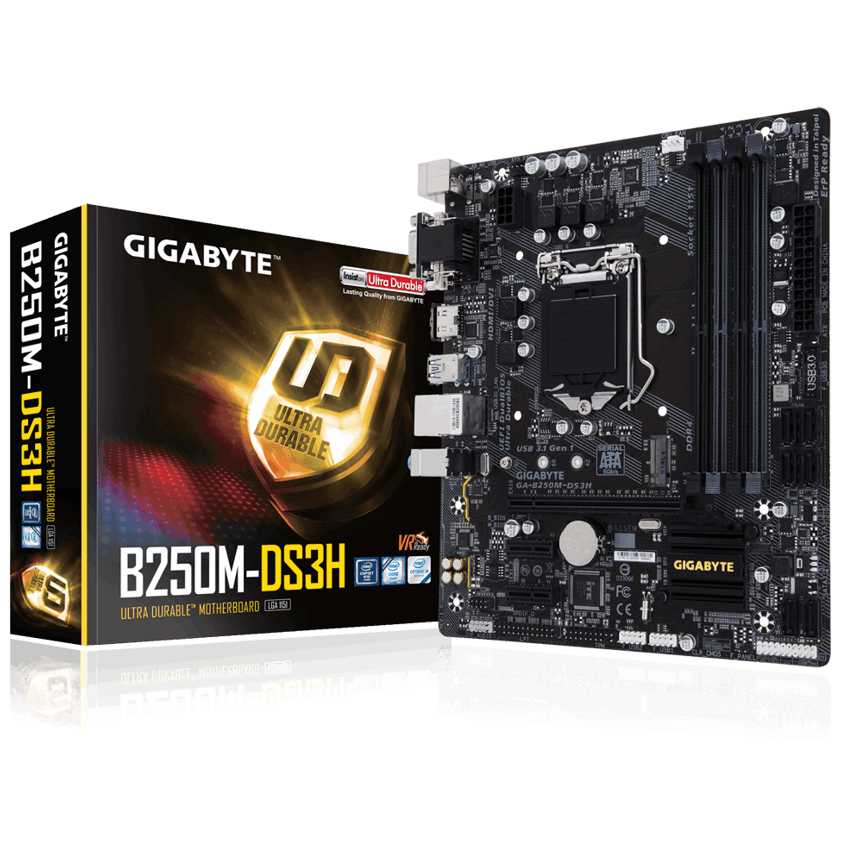 Descripción Gigabyte GA-B250M-DS3H. tipos de memoria compatibles: DDR4-SDRAM, Tipo de ranuras de memoria: DIMM, Canales de memoria: Dual. Familia de procesador: Intel, Procesador compatible: Celeron, Core i3, Core i5, Core i7, Pentium, Socket de procesador: LGA1151. Componente para: PC, Familia de componentes de tarjeta madre: Intel, Circuito integrado de tarjeta madre: Intel B250. Tipos de BIOS: UEFI AMI, BIOS, tamaño de memoria: 64 MB, Versión ACPI: 5.0. Ancho: 193 mm, Profundidad: 226 mm