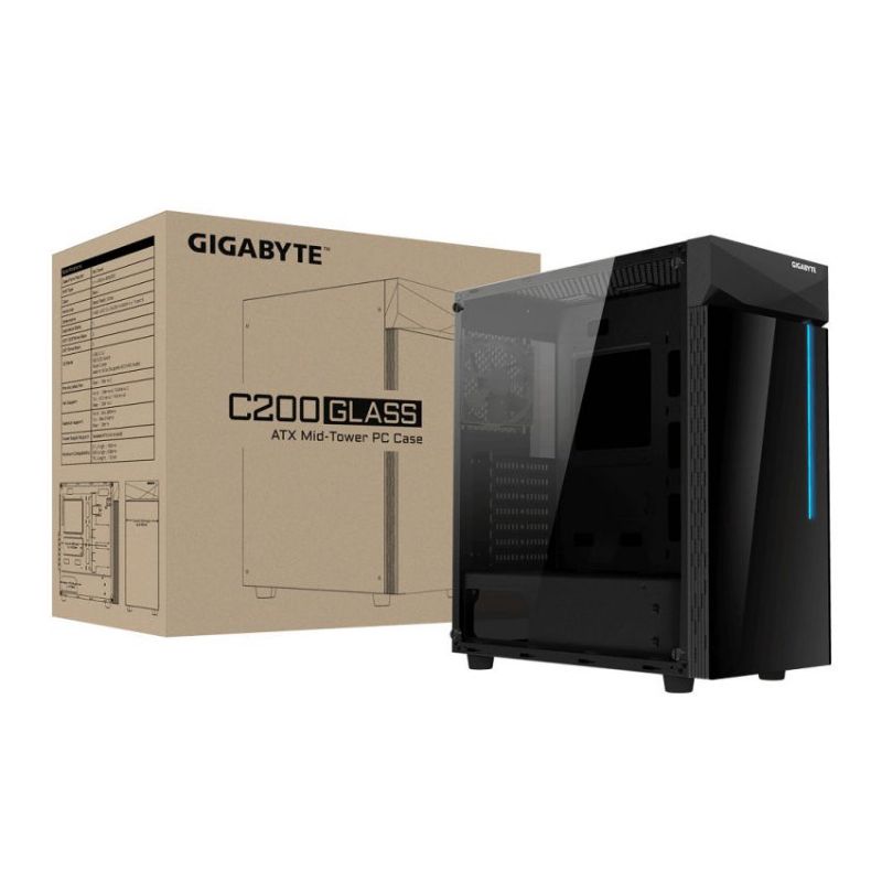 Descripción Gigabyte C200. Factor de forma: Midi Tower, Tipo: PC, Material: Vidrio, De plástico, Acero. Ubicación de fuente de alimentación: Fondo, Factores de forma de la fuente de alimentación compatibles: ATX. Diámetro de ventiladores frontales soportados: 120,140,240,280 mm, Diámetro de ventiladores traseros soportados: 120 mm, Diámetros de ventiladores superiores soportados: 120,240 mm. Tamaños de disco duro soportados: 2.5,3.5". Ancho: 210 mm, Profundidad: 435 mm, Altura: 480 mm