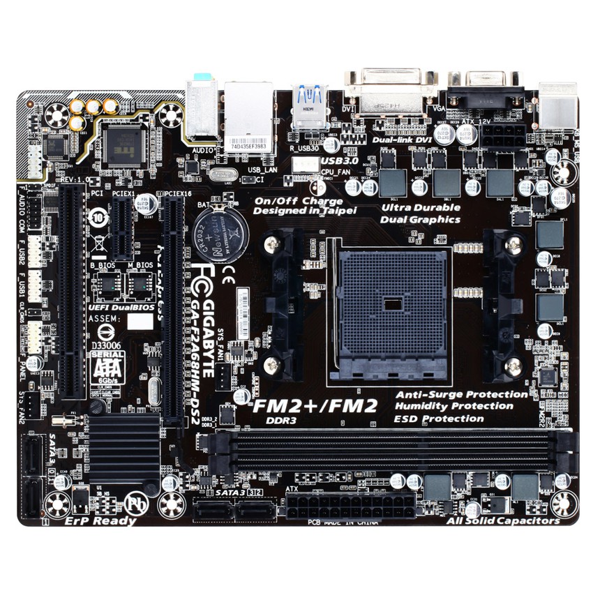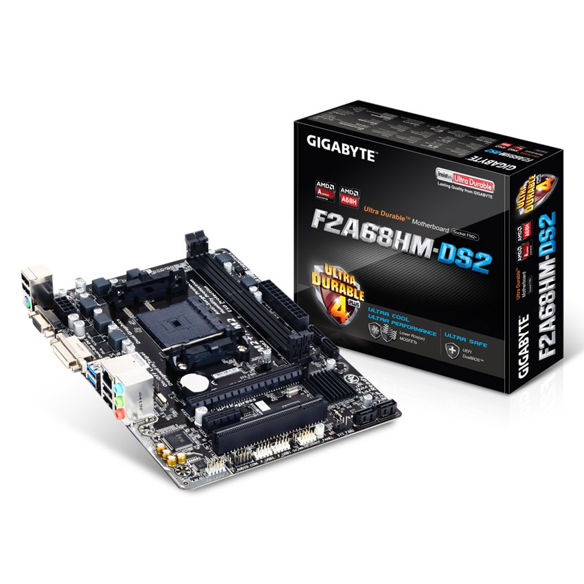 Descripción Gigabyte GA-F2A68HM-DS2. tipos de memoria compatibles: DDR3-SDRAM, Tipo de ranuras de memoria: DIMM, Velocidades de reloj de memoria soportadas: 1333,1600,1866,2133,2400 MHz. Familia de procesador: AMD, Procesador compatible: AMD A,Athlon, Socket de procesador: Socket FM2+. Interfaces de disco de almacenamiento soportados: Serial ATA III. Tipo de interfaz ethernet: Gigabit Ethernet. Componente para: PC, Familia de componentes de tarjeta madre: AMD, Circuito integrado de tarjeta madre: AMD A68H