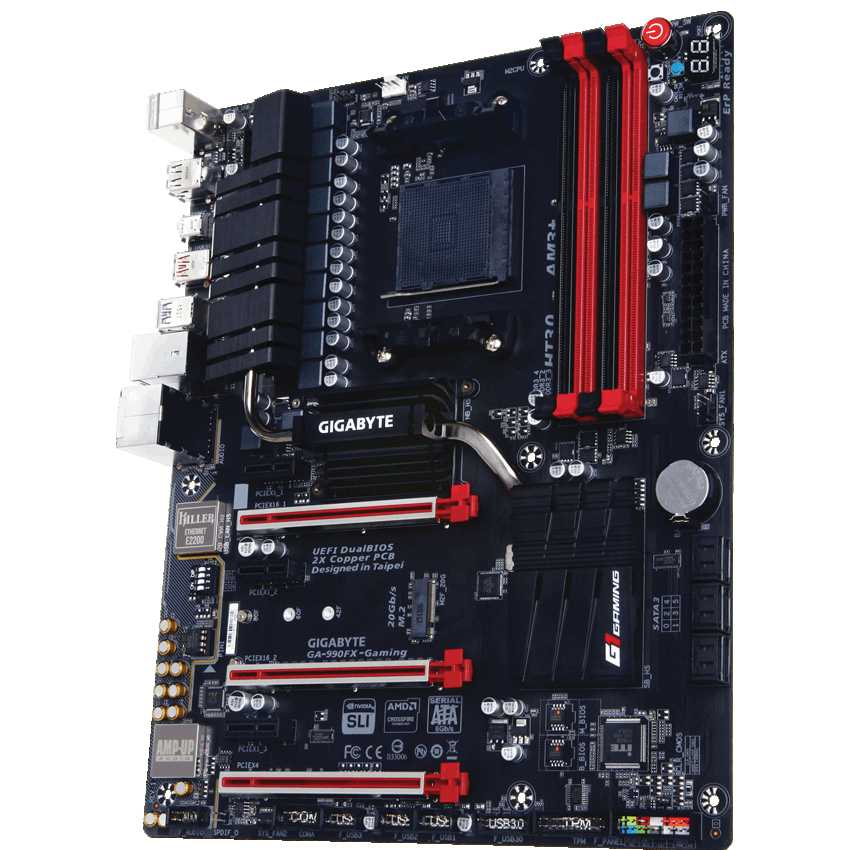 DescripciónGigabyte GA-990FX-Gaming. tipos de memoria compatibles: DDR3-SDRAM, Tipo de ranuras de memoria: DIMM, Canales de memoria: Dual. Familia de procesador: AMD, Procesador compatible: Athlon II, Phenom FX, Phenom II Dual-Core Mobile, Phenom II Quad-Core Mobile, Phenom II Triple-Core , Socket de procesador: Socket AM3+. Interfaces de unidad de disco duro soportadas: M.2, Serial ATA III. Controlador LAN: Atheros Killer E2201, Tipo de interfaz ethernet: Gigabit. Componente para: PC, Familia de componentes de tarjeta madre: AMD, Circuito integrado de tarjeta madre: AMD 990FXEspecificacionestipos de memoria compatibles: DDR3-SDRAMTipo de ranuras de memoria: DIMMNúmero de ranuras de memoria: 4Canales de memoria: DualVelocidades de reloj de memoria soportadas: 1066,1333,1600,1866,2000 MHzMemoria interna máxima: 32 GBMemoria sin buffer: SiFamilia de procesador: AMDProcesador compatible: Athlon II, Phenom FX, Phenom II Dual-Core Mobile, Phenom II Quad-Core Mobile, Phenom II Triple-Core MobileSocket de procesador: Socket AM3+Máx.número de procesador SMP: 1USB 2.0, conectores: 3Conectores USB 3.0 ( 3.1 Gen 1 ): 1Interfaces de unidad de disco duro soportadas: M.2, Serial ATA IIINúmero de conectores SATA: 6S/PDIF, conector de salida: SiConector de ventilador CPU: SiConector de potencia ATX (24 pines): SiNúmero de conectores a ventilador de chasis: 2Conector de audio en panel frontal: SiConector para ventilador: SiConector TPM: SiNúmero de conectores SATA III: 6Conector de energía EPS (8-pin): SiCabecera de puerto serie: 1Puerto serial via cabezal interno: SiNúmero de ranuras M.2 (M): 1Cantidad de puertos USB 2.0: 6Cantidad de puertos tipo A USB 3.0 (3.1 Gen 1): 2Cantidad de puertos tipo A USB 3.1 (3.1 Gen 2): 1Cantidad de puertos tipo C USB 3.1 (3.1 Gen 2): 1Ethernet LAN (RJ-45) cantidad de puertos: 1Puerto de ratón PS/2: 1Puerto de salida S/PDIF: SiEthernet: SiControlador LAN: Atheros Killer E2201Tipo de interfaz ethernet: GigabitComponente para: PCFamilia de componentes de tarjeta madre: AMDCircuito integrado de tarjeta madre: AMD 990FXTarjeta madre, factor de forma: ATXCanales de salida de audio: 7.1Niveles RAID: 0, 1, 5, 10, JBODSistema de audio: Realtek ALC1150Southbridge de tarjeta madre: AMD SB950Tipo de enfriamiento: PasivoMonitoreo de la salud de PC: CPU, Ventilador, Power supply, Temperatura, TensiónSistema operativo Windows soportado: SiSoporte para proceso paralelo: 2-Way CrossFireX, 2-Way SLISoporte de gráficos discretos: SiPCI Express x1 (Gen 2.x) ranuras: 3PCI Express x16 Gen (2.x) ranuras: 3Tipos de BIOS: UEFI AMIBIOS, tamaño de memoria: 4 MBVersión ACPI: 5.0Jumper Clear CMOS: SiBotón de limpieza CMOS: SiAncho: 30,5 cmProfundidad: 24,4 cm