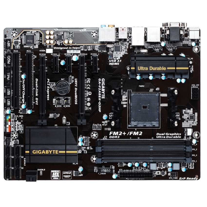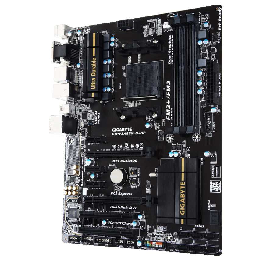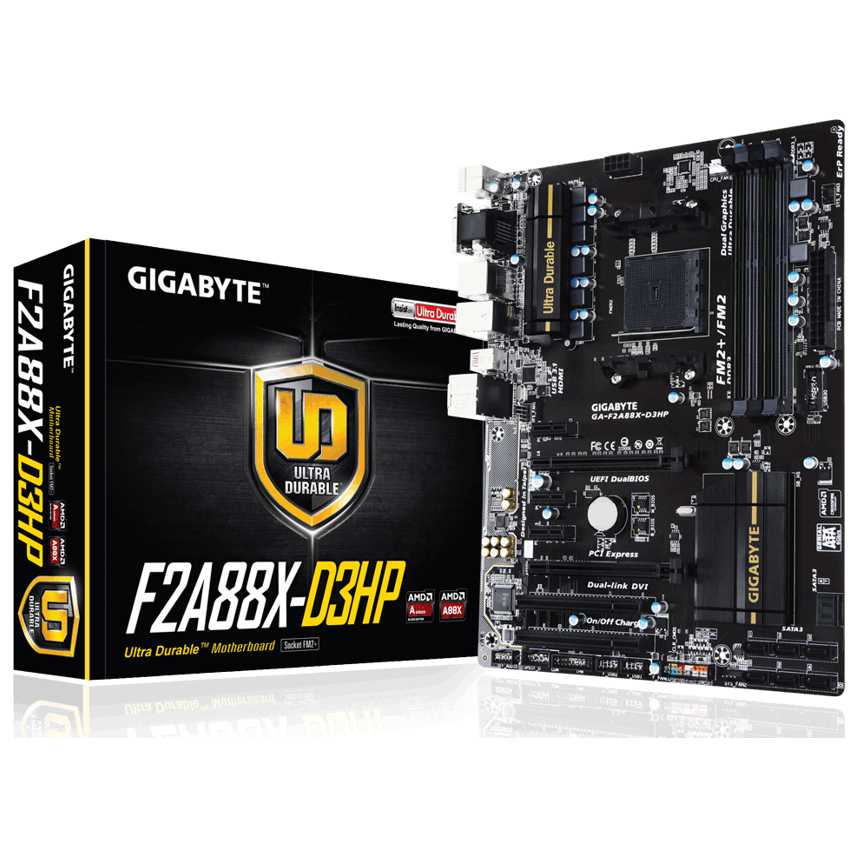 Descripción Gigabyte GA-F2A88X-D3HP (rev. 1.0). tipos de memoria compatibles: DDR3-SDRAM, Tipo de ranuras de memoria: DIMM, Canales de memoria: Dual. Familia de procesador: AMD, Procesador compatible: AMD A, Athlon, Socket de procesador: Socket FM2+. Interfaces de unidad de disco duro soportadas: SATA. Versión HDMI: 1.4a. Tipo de interfaz ethernet: Gigabit Ethernet