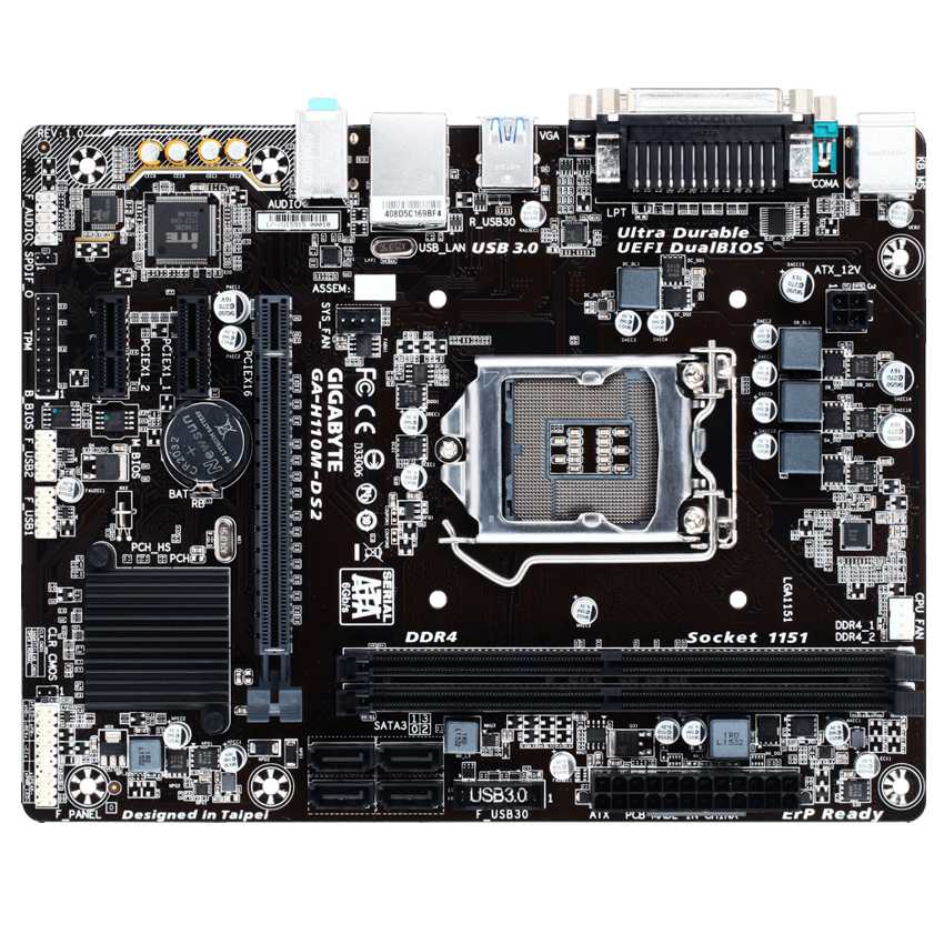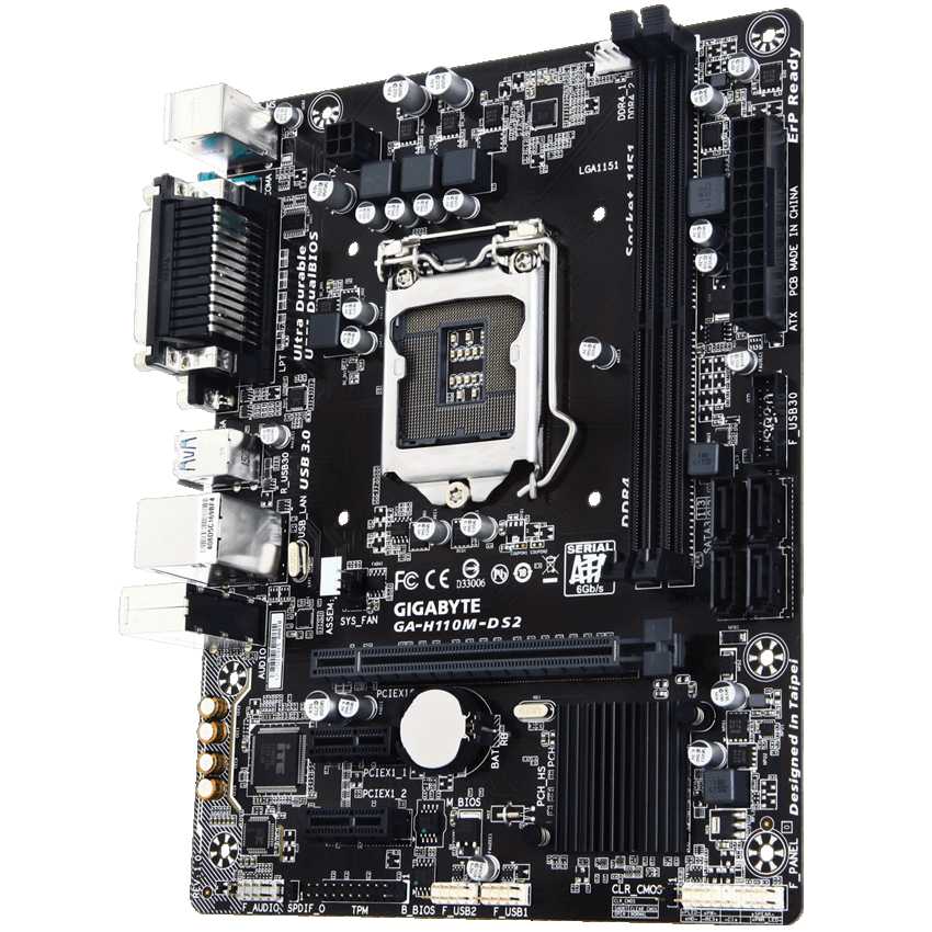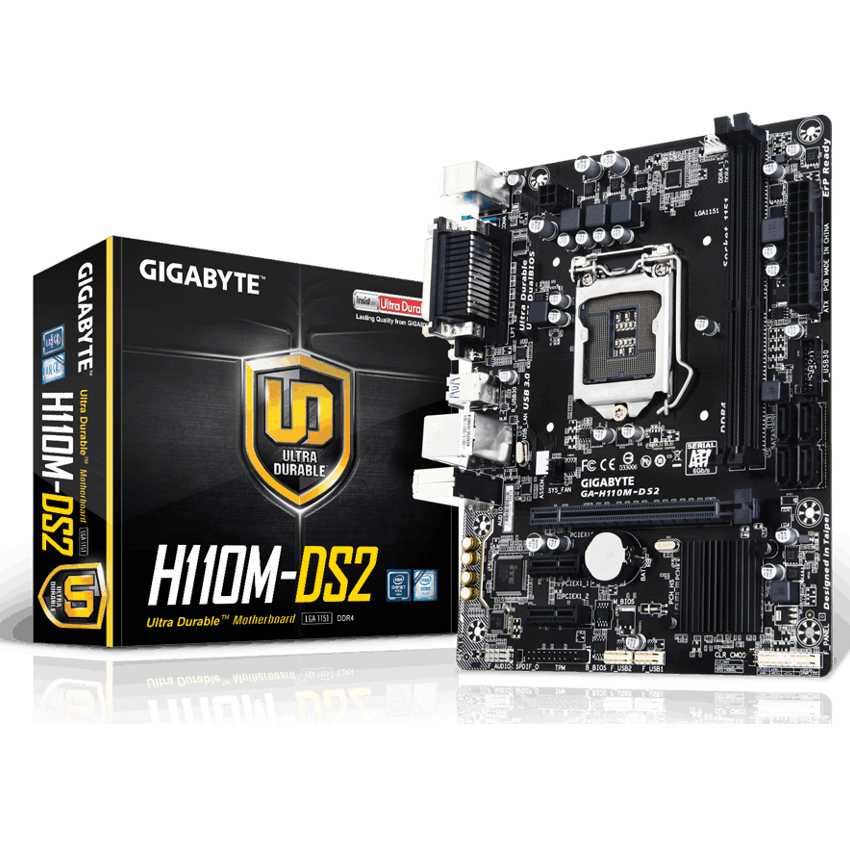 Descripción Gigabyte GA-H110M-DS2. tipos de memoria compatibles: DDR4-SDRAM, Tipo de ranuras de memoria: DIMM, Canales de memoria: Dual. Familia de procesador: Intel, Procesador compatible: Celeron, Core i3, Core i5, Core i7, Pentium, Socket de procesador: LGA1151. Interfaces de unidad de disco duro soportadas: Serial ATA III. Tipo de interfaz ethernet: Gigabit. Componente para: PC, Familia de componentes de tarjeta madre: Intel, Circuito integrado de tarjeta madre: Intel H110