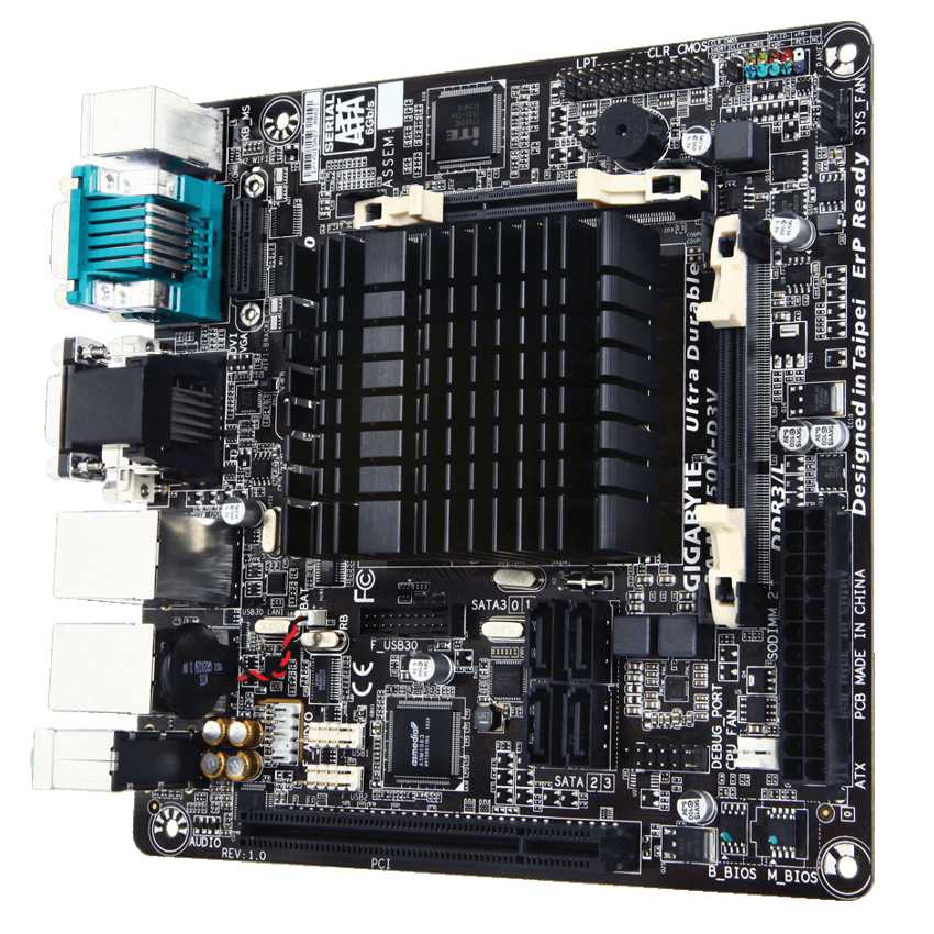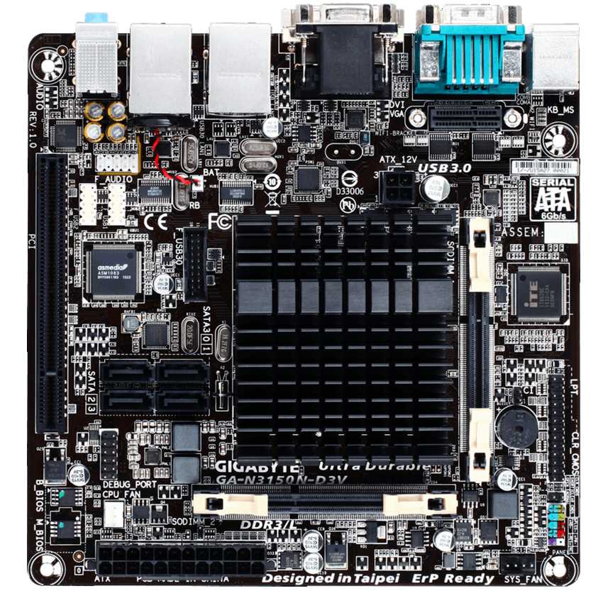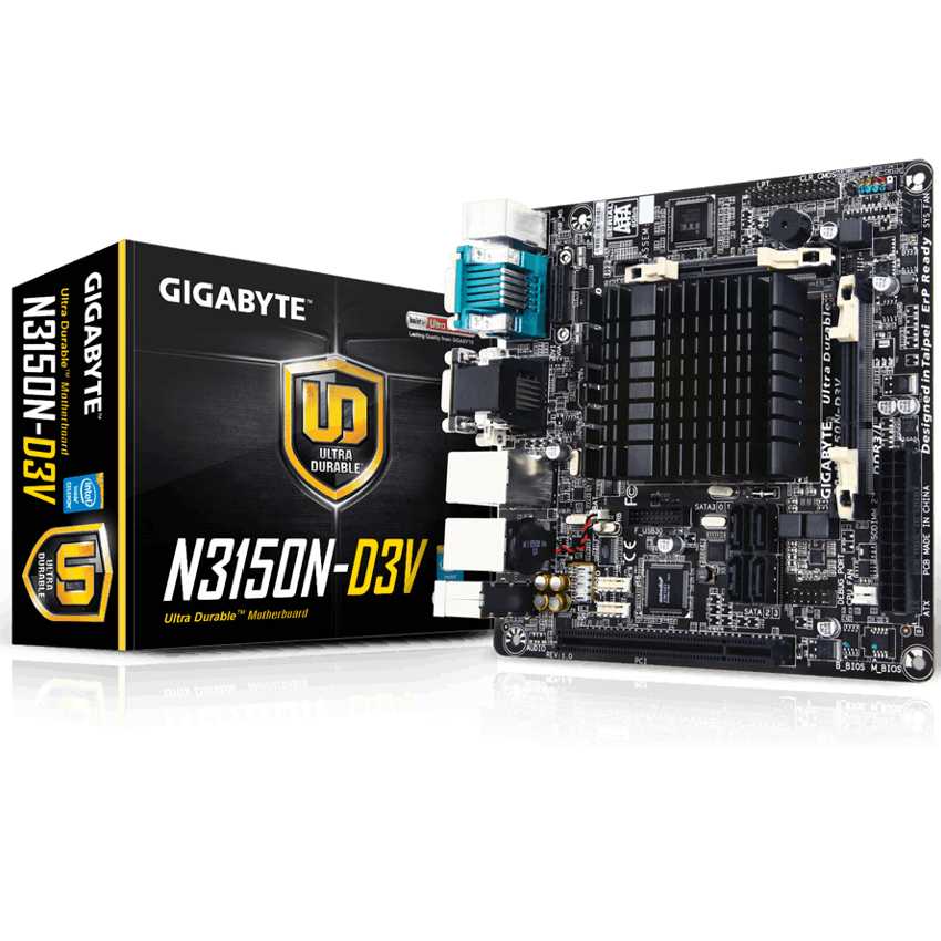 Descripción Gigabyte GA-N3150N-D3V (rev. 1.0). tipos de memoria compatibles: DDR3-SDRAM, DDR3L-SDRAM, Tipo de ranuras de memoria: SO-DIMM, Canales de memoria: Dual. Familia de procesador: Intel, Procesador compatible: Celeron, Socket de procesador: BGA1170. Interfaces de unidad de disco duro soportadas: Serial ATA III. Tipo de interfaz ethernet: Gigabit. Componente para: PC, Familia de componentes de tarjeta madre: Intel, Tarjeta madre, factor de forma: Mini ITX