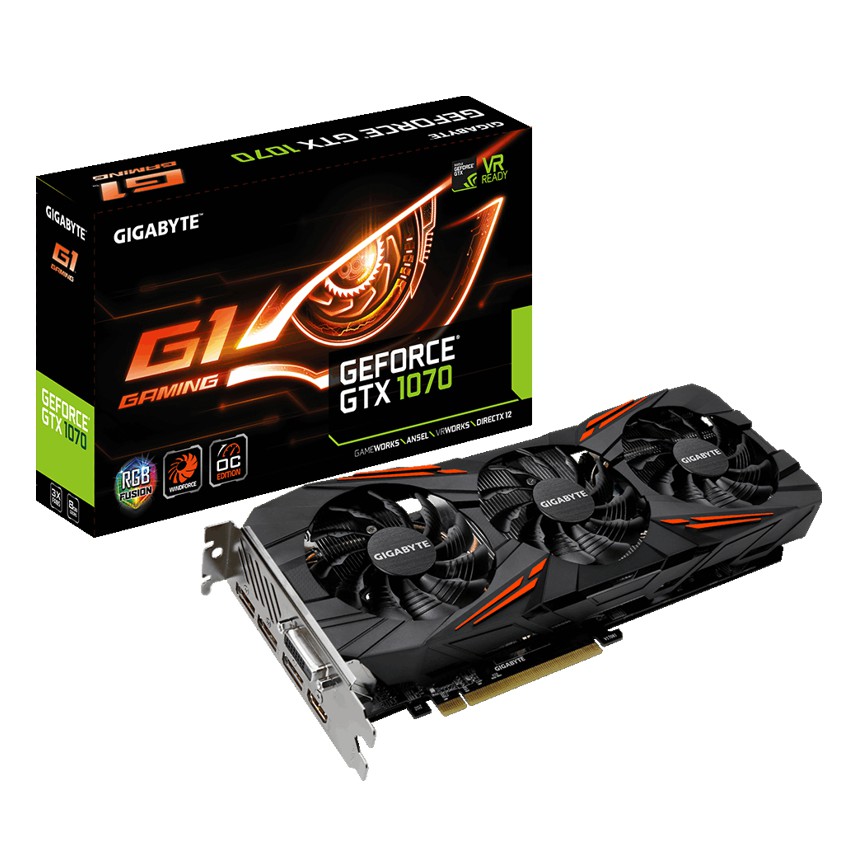 Descripción Gigabyte GeForce GTX 1070 G1 Gaming 8G. Familia de procesadores de gráficos: NVIDIA, Procesador gráfico: GeForce GTX 1070, Máxima resolución: 7680 x 4320 Pixeles. Gráficos discretos memoria del adaptador: 8 GB, Tipo de memoria de adaptador gráfico: GDDR5, Ancho de datos: 256 bit. Tipo de interfaz: PCI Express x16 3.0, Versión HDMI: 2.0b. Tipo de enfriamiento: Activo, Número de ventiladores: 3 fan(s), Factor de forma: ATX. Suministro de energía al sistema mínimo: 500 W, Conectores de energia suplementario: 1x 8-pin