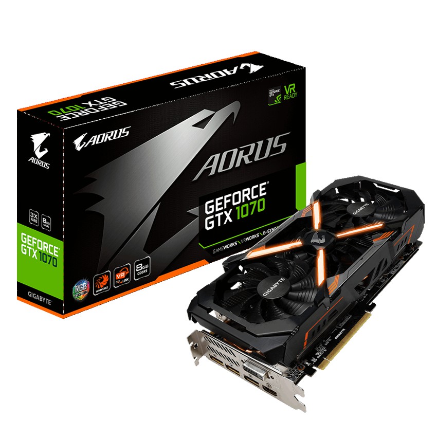 Descripción Gigabyte AORUS GeForce GTX 1070 8G. Familia de procesadores de gráficos: NVIDIA, Procesador gráfico: GeForce GTX 1070, Máxima resolución: 7680 x 4320 Pixeles. Gráficos discretos memoria del adaptador: 8 GB, Tipo de memoria de adaptador gráfico: GDDR5, Ancho de datos: 256 bit. Tipo de interfaz: PCI Express x16 3.0, Versión HDMI: 2.0b. Tipo de enfriamiento: Activo, Número de ventiladores: 3 fan(s), Factor de forma: ATX. Suministro de energía al sistema mínimo: 500 W, Conectores de energia suplementario: 1x 6-pin, 1x 8-pin