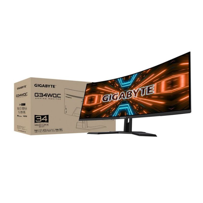 Descripción Gigabyte G34WQC. Diagonal de la pantalla: 86,4 cm (34"), Resolución de la pantalla: 3440 x 1440 Pixeles, Tipo HD: Quad HD, Tecnología de visualización: LED, Superficie de la pantalla: Mate, Tiempo de respuesta: 1 ms, Relación de aspecto nativa: 21:9, Ángulo de visión, horizontal: 178°, Ángulo de visión, vertical: 178°. Altavoces incorporados. montaje VESA, Ajustes de altura. Color del producto: Negro