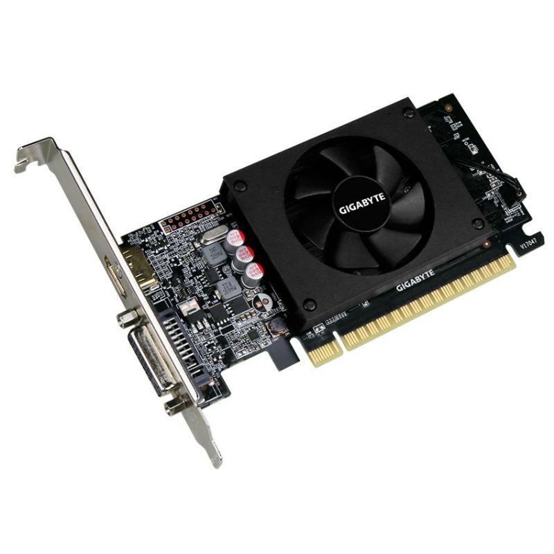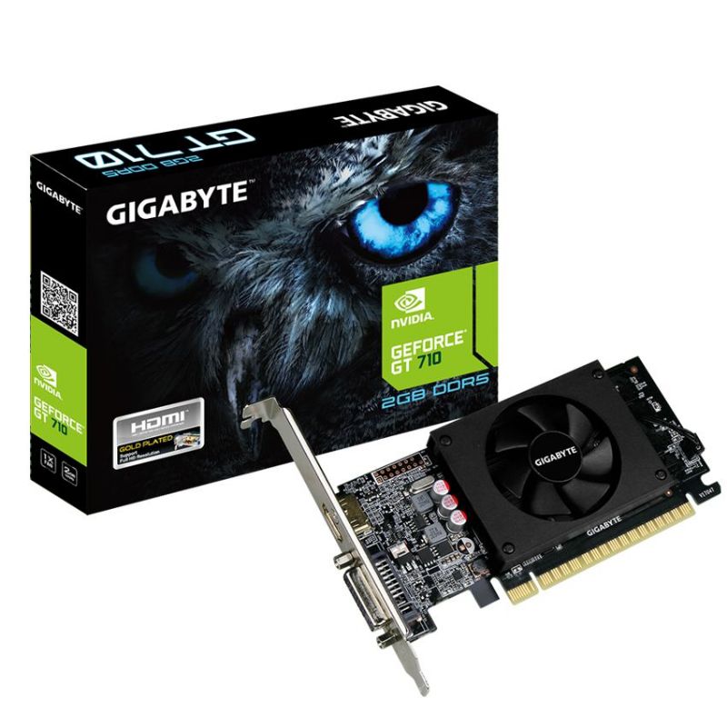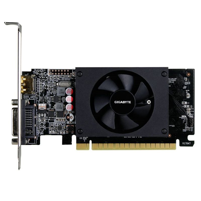 Descripción Gigabyte GeForce GT 710 2GB. Familia de procesadores de gráficos: NVIDIA, Procesador gráfico: GeForce GT 710, Frecuencia del procesador: 954 MHz. Capacidad memoria de adaptador gráfico: 2 GB, Tipo de memoria de adaptador gráfico: GDDR5, Ancho de datos: 64 bit, Velocidad de memoria del reloj: 5010 MHz. Máxima resolución: 4096 x 2160 Pixeles. Versión DirectX: 12.0, Versión OpenGL: 4.5, Dual Link DVI. Tipo de interfaz: PCI Express x8 2.0. Tipo de enfriamiento: Activo, Número de ventiladores: 1 Ventilador(es)