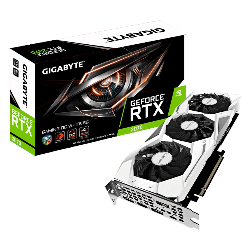 Descripción Gigabyte GV-N2070GAMINGOC WHITE-8GC. Familia de procesadores de gráficos: NVIDIA, Procesador gráfico: GeForce RTX 2070, Frecuencia del procesador: 1725 MHz. Capacidad memoria de adaptador gráfico: 8 GB, Tipo de memoria de adaptador gráfico: GDDR6, Ancho de datos: 256 bit, Velocidad de memoria del reloj: 14000 MHz. Máxima resolución: 7680 x 4320 Pixeles. Versión DirectX: 12.0, Versión OpenGL: 4.5. Tipo de interfaz: PCI Express x16 3.0. Tipo de enfriamiento: Activo, Número de ventiladores: 3 Ventilador(es), Iluminación de color: Rojo/Verde/Azul