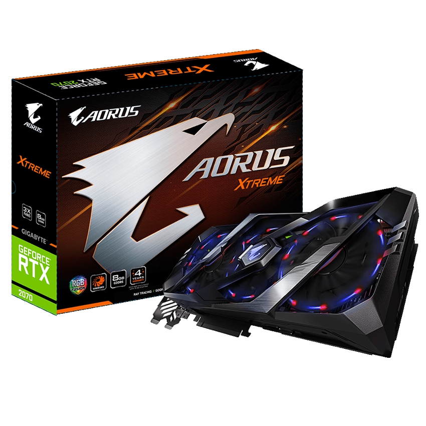 Descripción Gigabyte GV-N2070AORUS X-8GC. Familia de procesadores de gráficos: NVIDIA, Procesador gráfico: GeForce RTX 2070, Frecuencia del procesador: 1815 MHz. Capacidad memoria de adaptador gráfico: 8 GB, Tipo de memoria de adaptador gráfico: GDDR6, Ancho de datos: 256 bit, Velocidad de memoria del reloj: 14142 MHz. Máxima resolución: 7680 x 4320 Pixeles. Versión DirectX: 12.0, Versión OpenGL: 4.5. Tipo de interfaz: PCI Express x16 3.0. Tipo de enfriamiento: Activo, Número de ventiladores: 3 Ventilador(es), Iluminación de color: Rojo/Verde/Azul