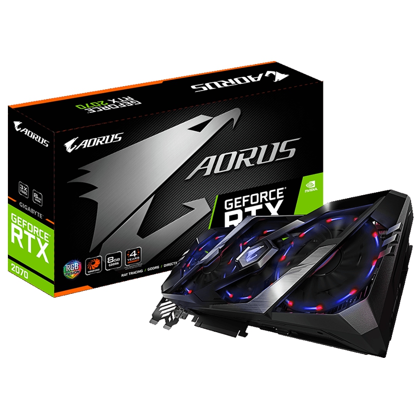 Descripción Gigabyte GV-N2070AORUS-8GC. Familia de procesadores de gráficos: NVIDIA, Procesador gráfico: GeForce RTX 2070, Frecuencia del procesador: 1770 MHz. Capacidad memoria de adaptador gráfico: 8 GB, Tipo de memoria de adaptador gráfico: GDDR6, Ancho de datos: 256 bit, Velocidad de memoria del reloj: 14000 MHz. Máxima resolución: 7680 x 4320 Pixeles. Versión DirectX: 12.0, Versión OpenGL: 4.5. Tipo de interfaz: PCI Express x16 3.0. Tipo de enfriamiento: Activo, Número de ventiladores: 3 Ventilador(es), Iluminación de color: Rojo/Verde/Azul