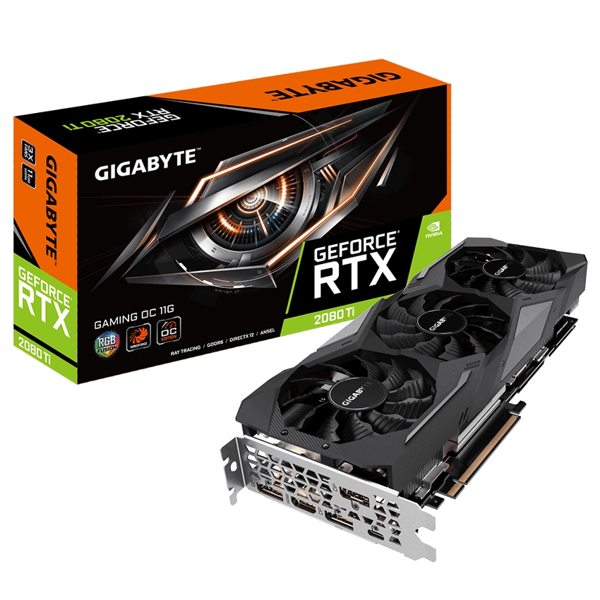 Descripción Gigabyte GV-N208TGAMING OC-11GC. Familia de procesadores de gráficos: NVIDIA, Procesador gráfico: GeForce RTX 2080 Ti. Capacidad memoria de adaptador gráfico: 11 GB, Tipo de memoria de adaptador gráfico: GDDR6, Ancho de datos: 352 bit. Máxima resolución: 7680 x 4320 Pixeles. Versión DirectX: 12.0, Versión OpenGL: 4.5. Tipo de interfaz: PCI Express x16 3.0. Tipo de enfriamiento: Activo, Número de ventiladores: 3 Ventilador(es)