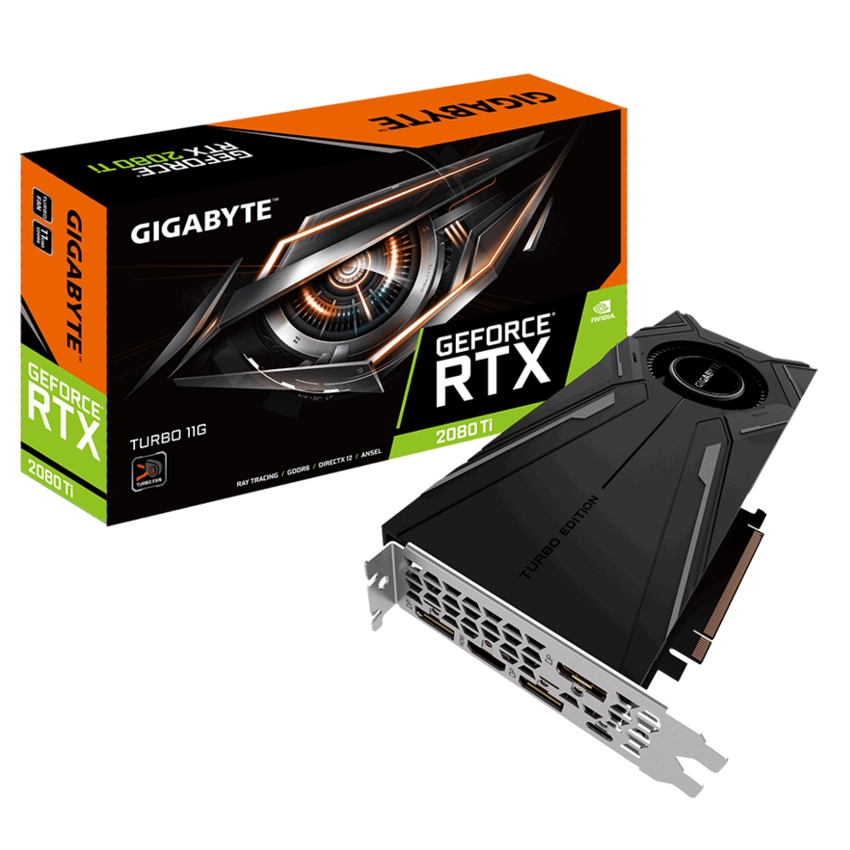 Descripción Gigabyte GV-N208TTURBO-11GC. Familia de procesadores de gráficos: NVIDIA, Procesador gráfico: GeForce RTX 2080 Ti, Frecuencia del procesador: 1545 MHz. Capacidad memoria de adaptador gráfico: 11 GB, Tipo de memoria de adaptador gráfico: GDDR6, Ancho de datos: 352 bit, Velocidad de memoria del reloj: 14000 MHz. Máxima resolución: 7680 x 4320 Pixeles. Versión DirectX: 12.0, Versión OpenGL: 4.5. Tipo de interfaz: PCI Express x16 3.0. Tipo de enfriamiento: Activo, Número de ventiladores: 1 Ventilador(es)