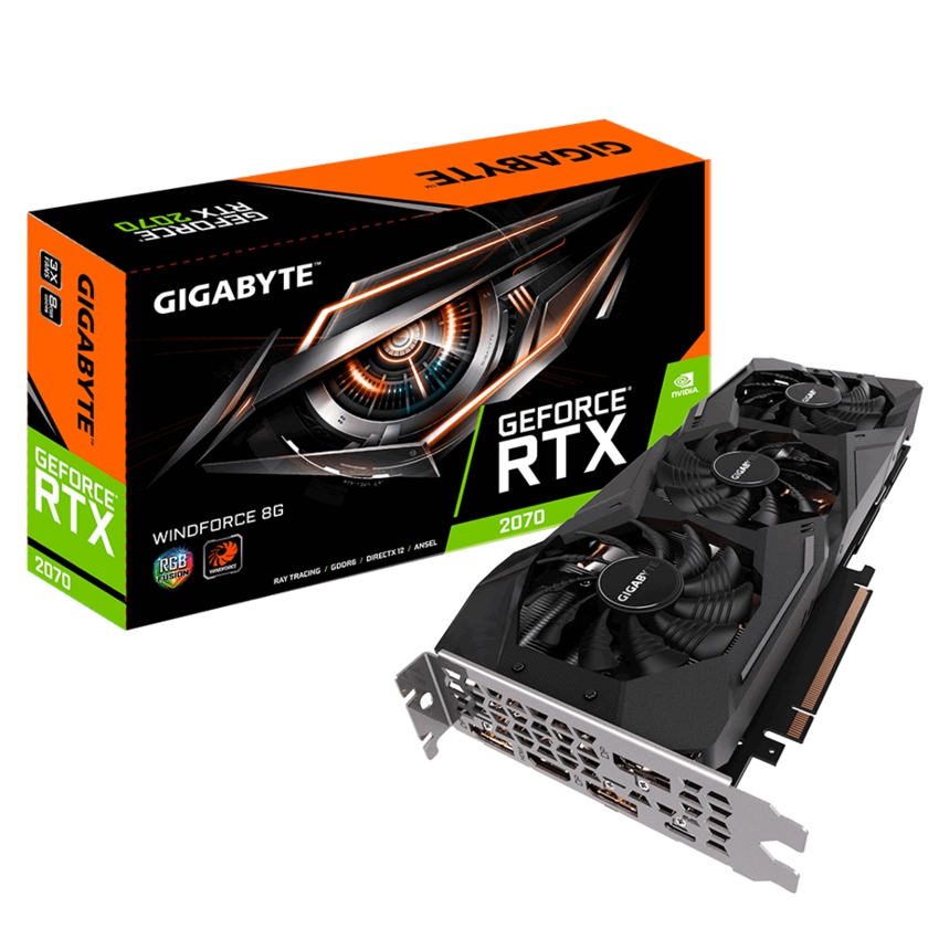Descripción Gigabyte GV-N2070WF3-8GC. Familia de procesadores de gráficos: NVIDIA, Procesador gráfico: GeForce RTX 2070, Frecuencia del procesador: 1620 MHz. Capacidad memoria de adaptador gráfico: 8 GB, Tipo de memoria de adaptador gráfico: GDDR6, Ancho de datos: 256 bit, Velocidad de memoria del reloj: 14000 MHz. Máxima resolución: 7680 x 4320 Pixeles. Versión DirectX: 12.0, Versión OpenGL: 4.5. Tipo de interfaz: PCI Express x16 3.0. Tipo de enfriamiento: Activo, Número de ventiladores: 3 Ventilador(es), Iluminación de color: Rojo/Verde/Azul