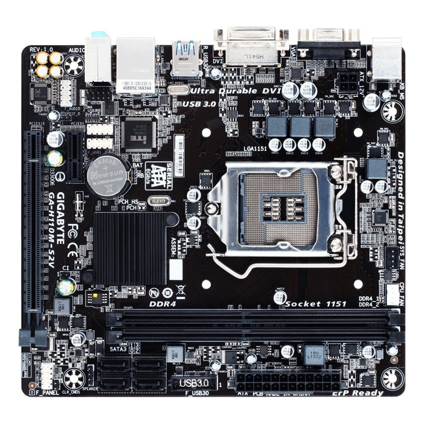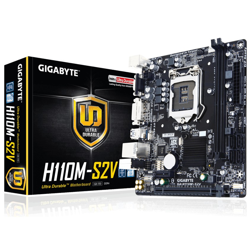 Descripción Gigabyte GA-H110M-S2V. tipos de memoria compatibles: DDR4-SDRAM, Tipo de ranuras de memoria: DIMM, Canales de memoria: Dual. Familia de procesador: Intel, Procesador compatible: Celeron, Core i3, Core i5, Core i7, Pentium, Socket de procesador: LGA1151. Interfaces de disco de almacenamiento soportados: Serial ATA III. Tipo de interfaz ethernet: Gigabit Ethernet. Componente para: PC, Familia de componentes de tarjeta madre: Intel, Circuito integrado de tarjeta madre: Intel H110
