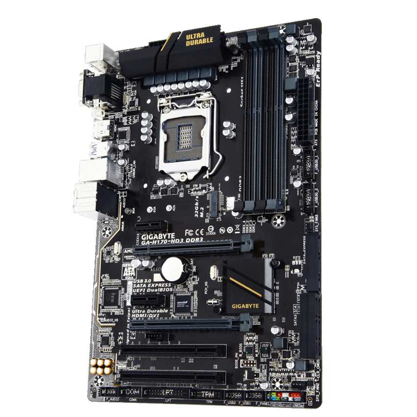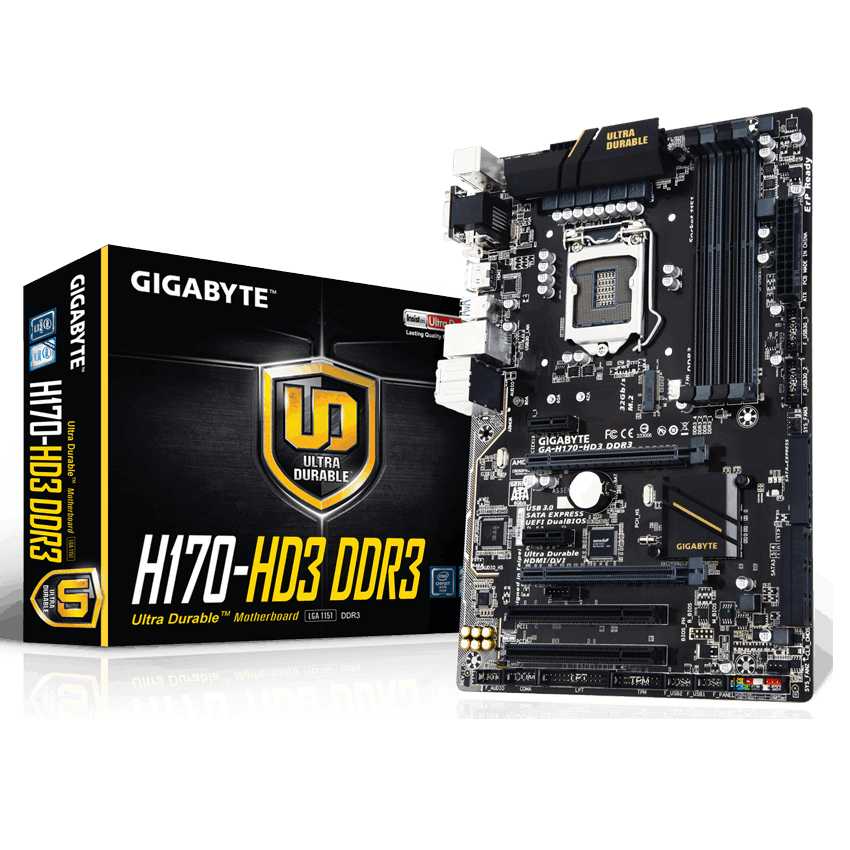Descripción Gigabyte GA-H170-HD3 DDR3. tipos de memoria compatibles: DDR3-SDRAM, DDR3L-SDRAM, Tipo de ranuras de memoria: DIMM, Canales de memoria: Dual. Familia de procesador: Intel, Procesador compatible: Celeron, Core i3, Core i5, Core i7, Pentium, Socket de procesador: LGA1151. Interfaces de unidad de disco duro soportadas: M.2, Serial ATA III. Versión HDMI: 1.4. Tipo de interfaz ethernet: Gigabit