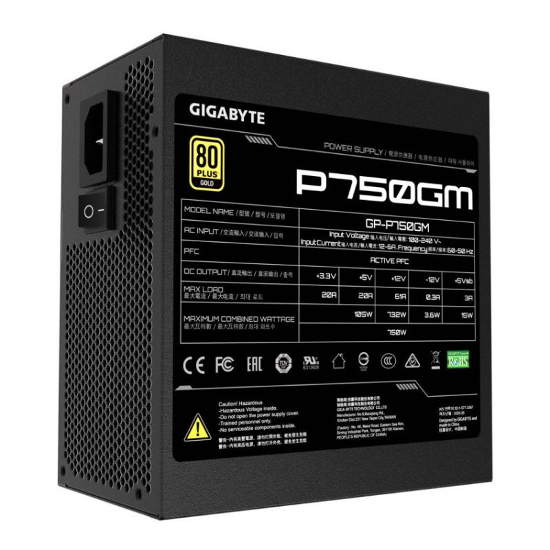 Descripción Gigabyte P750GM. Potencia total: 750 W, Voltaje de entrada AC: 100 - 240 V, Frecuencia de entrada AC: 50/60 Hz. Alimentador de energía para tarjeta madre: 20+4 pin ATX, Longitud del cable de alimentación de la placa base: 61 cm, Longitud del cable de alimentación SATA: 150,600 mm. Utilizar con: PC, Factor de forma de fuente de alimentación (PSU): ATX, Certificación 80 PLUS: 80 PLUS Gold. Color del producto: Negro, Tipo de enfriamiento: Activo, Diámetro de ventilador: 12 cm. Ancho: 150 mm, Profundidad: 140 mm, Altura: 86 mm