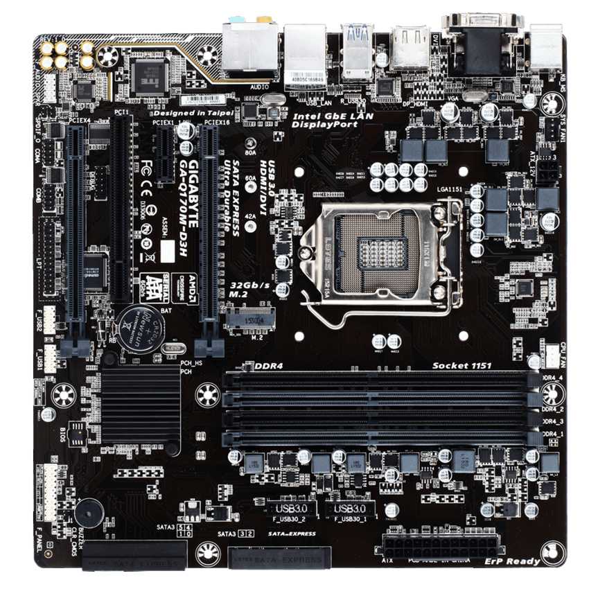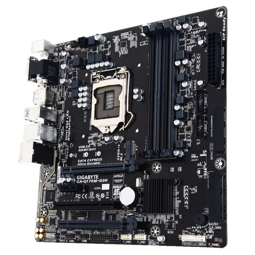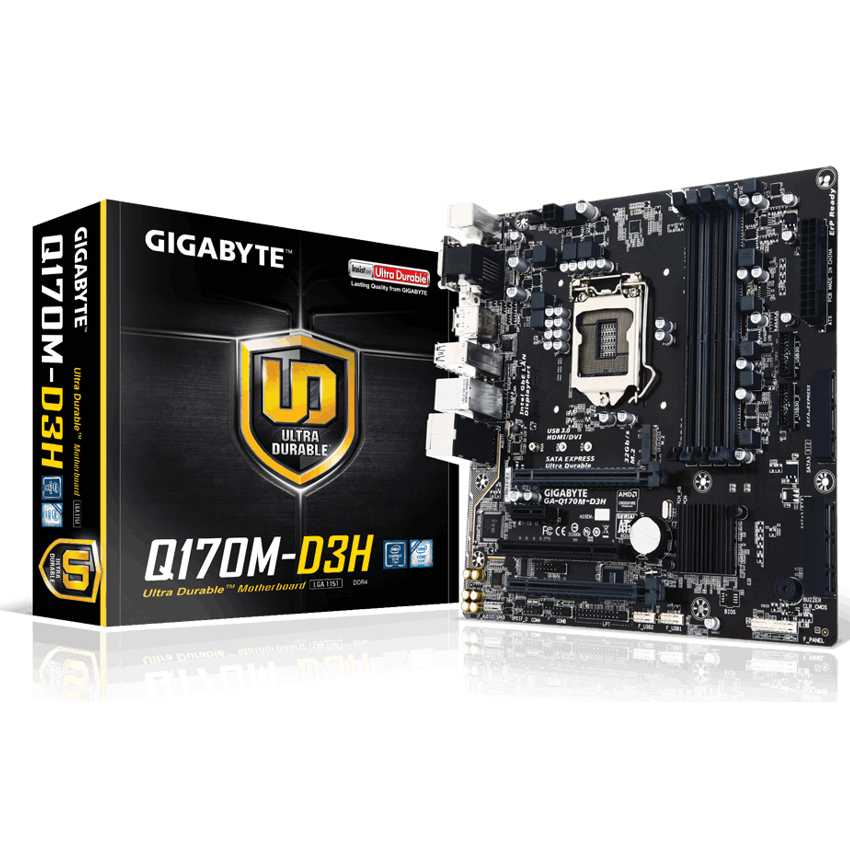 Descripción Gigabyte GA-Q170M-D3H. tipos de memoria compatibles: DDR4-SDRAM, Tipo de ranuras de memoria: DIMM, Canales de memoria: Dual. Familia de procesador: Intel, Procesador compatible: Celeron, Core i3, Core i5, Core i7, Socket de procesador: LGA1151. Interfaces de unidad de disco duro soportadas: M.2, Serial ATA III. Tipo de interfaz ethernet: Gigabit. Componente para: PC, Familia de componentes de tarjeta madre: Intel, Circuito integrado de tarjeta madre: Intel Q170