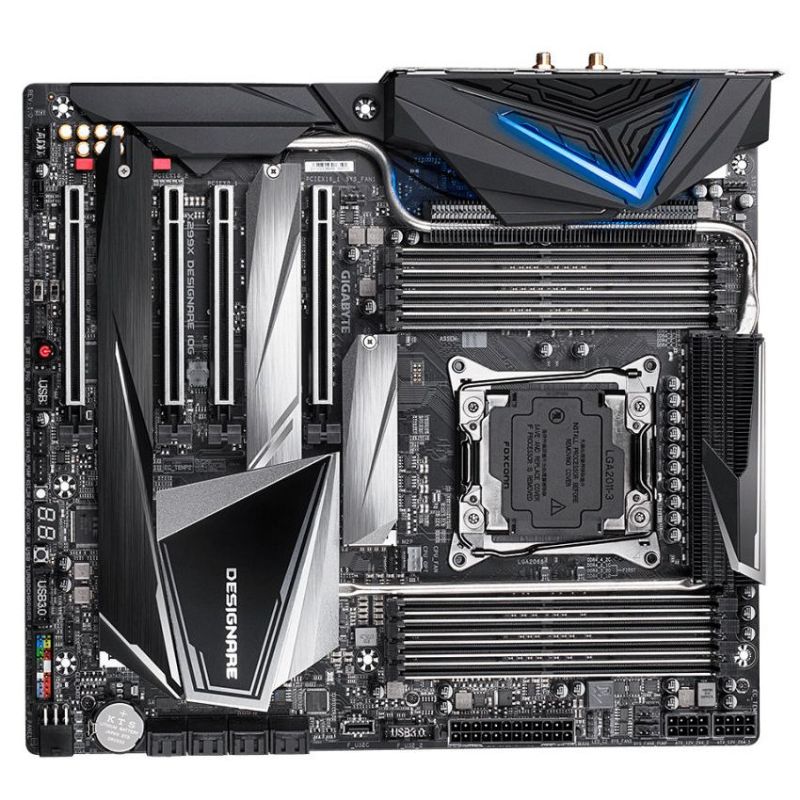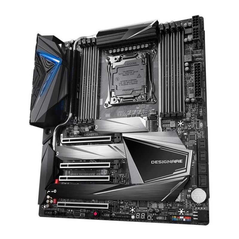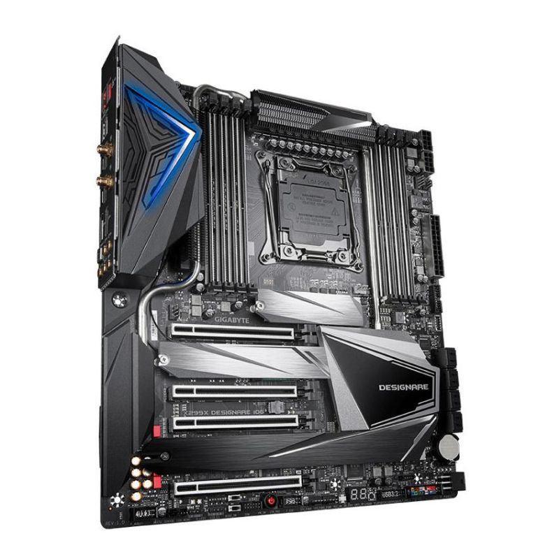 Descripción Gigabyte X299X Designare-10G. Fabricante de procesador: Intel, Socket de procesador: LGA 2066 (Socket R4), Procesador compatible: Intel Core i7, Intel Core i9. tipos de memoria compatibles: DDR4-SDRAM, Tipo de ranuras de memoria: DIMM, Velocidades de reloj de memoria soportadas: 2133,2400,2666,2933 MHz. Interfaces de disco de almacenamiento soportados: Serial ATA III. Soporte para proceso paralelo: 2-Way CrossFireX,2-Way SLI,Quad-GPU CrossFireX,Quad-GPU SLI, Memoria máxima de adaptador de gráficos: 1024 MB, Máxima resolución: 4096 x 2304 Pixeles. Tipo de interfaz ethernet: 10 Gigabit Ethernet, Wi-Fi estándares: 802.11a,802.11b,802.11g,Wi-Fi 4 (802.11n),Wi-Fi 5 (802.11ac),Wi-Fi 6 (802.11ax)