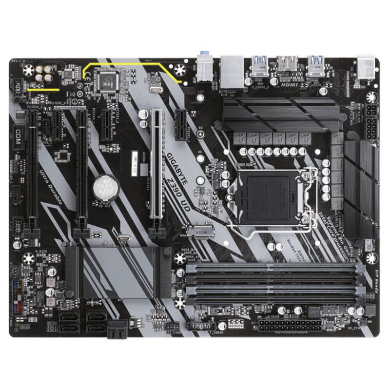 Descripción Gigabyte Z390 UD. Fabricante de procesador: Intel, Socket de procesador: LGA 1151 (Zócalo H4), Procesador compatible: Intel® Celeron®, Intel® Core? i3, Intel Core i5, Intel Core i7, Intel® Pentium®. tipos de memoria compatibles: DDR4-SDRAM, Tipo de ranuras de memoria: DIMM, Velocidades de reloj de memoria soportadas: 2133,2400,2666 MHz. Tipos de unidades de almacenamiento admitidas: Unidad de disco duro, SSD. Soporte para proceso paralelo: 2-Way CrossFireX,Quad-GPU CrossFireX. Tipo de interfaz ethernet: Gigabit Ethernet