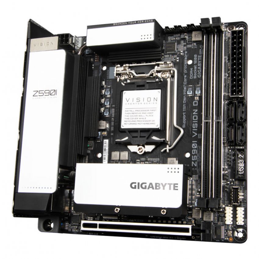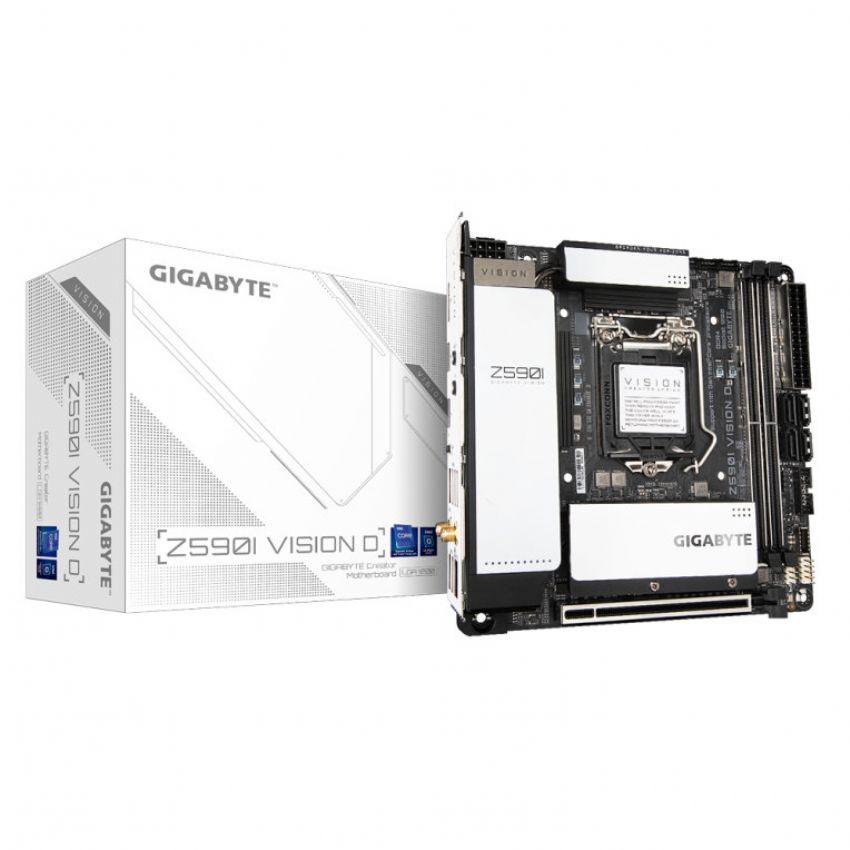 Descripción Gigabyte Z590I VISION D. Fabricante de procesador: Intel, Socket de procesador: LGA 1200, Procesador compatible: Intel® Celeron®, Intel® Core™ i3, Intel Core i5, Intel Core i7, Intel Core i9, Intel® Pentium®. tipos de memoria compatibles: DDR4-SDRAM, Tipo de ranuras de memoria: DIMM, Velocidades de reloj de memoria soportadas: 2133,2400,2666,2933,3000,3200 MHz. Interfaces de disco de almacenamiento soportados: M.2, Serial ATA III, Tipos de unidades de almacenamiento admitidas: HDD & SSD. Máxima resolución: 5120 x 2880 Pixeles. Conector USB: USB tipo A, USB Tipo C