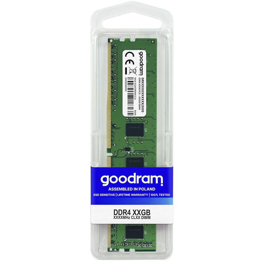 Descripción Goodram GR2666D464L19S/8G. Componente para: PC/servidor, Memoria interna: 8 GB, Diseño de memoria (módulos x tamaño): 1 x 8 GB, Tipo de memoria interna: DDR4, Velocidad de memoria del reloj: 2666 MHz, Forma de factor de memoria: 288-pin DIMM, Latencia CAS: 19