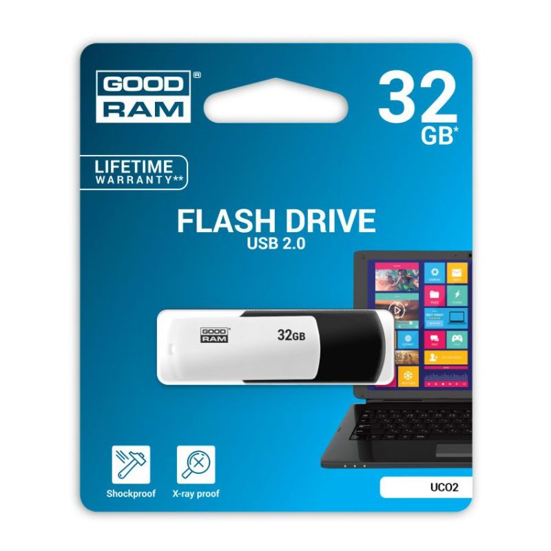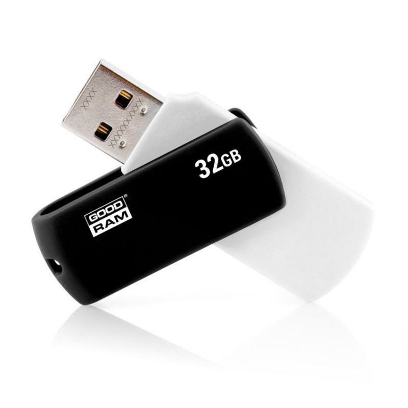 Descripción Goodram UCO2. Capacidad: 32 GB, Interfaz del dispositivo: USB tipo A, Versión USB: 2.0, Velocidad de lectura: 20 MB/s, Velocidad de escritura: 5 MB/s. Factor de forma: Girar. Peso: 8 g. Color del producto: Negro, Blanco